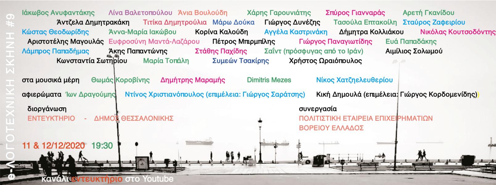 Στην e-Λογοτεχνική Σκηνή #9 συμμετέχουν 31 συγγραφείς από τη Θεσσαλονίκη, την Αθήνα, διάφορες περιφερειακές πόλεις, από την Κύπρο και από το εξωτερικό· με αλφαβητική σειρά: Ιάκωβος Ανυφαντάκης, Λίνα Βαλετοπούλου, Άνια Βουλούδη, Χάρης Γαρουνιάτης, Σπύρος Γιανναράς, Αρετή Γκανίδου, Άντζελα Δημητρακάκη, Τιτίκα Δημητρούλια, Μάρω Δούκα, Γιώργος Δυνέζης, Τασούλα Επτακοίλη, Σταύρος Ζαφειρίου, Κώστας Θεοδωρίδης, Άννα-Μαρία Ιακώβου, Κορίνα Καλούδη, Αγγέλα Καστρινάκη, Δήμητρα Κολλιάκου, Νικόλας Κουτσοδόντης, Αριστοτέλης Μαγουλάς Ευφροσύνη Μαντά-Λαζάρου, Πέτρος Μπιρμπίλης, Γιώργος Παναγιωτίδης, Ευά Παπαδάκης, Λάμπρος Παπαδήμας, Άκης Παπαντώνης, Στάθης Παχίδης, Σαΐντ (πρόσφυγας από το Ιράν), Αιμίλιος Σολωμού, Κωνσταντία Σωτηρίου, Μαρία Τοπάλη, Συμεών Τσακίρης, Χρήστος Ωραιόπουλος.
