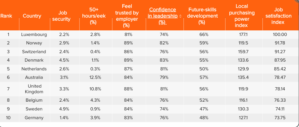 Η Ελβετία (91,27), η Δανία (87,95) και η Ολλανδία (85,42) συμπληρώνουν την πεντάδα των χωρών με την υψηλότερη ικανοποίηση από την εργασία. Οι υψηλές βαθμολογίες τους επηρεάζονται από τα χαμηλά ποσοστά υπερβολικής εργασίας, με μόλις 0,3% των εργαζομένων στην Ολλανδία να εργάζονται πάνω από 50 ώρες την εβδομάδα. Η Δανία κατέχει επίσης το υψηλότερο ποσοστό εμπιστοσύνης στην ηγεσία στην Ευρώπη, με το 83% των εργαζομένων να εμπιστεύονται τους εργοδότες τους.