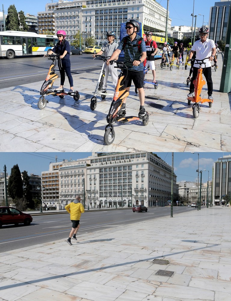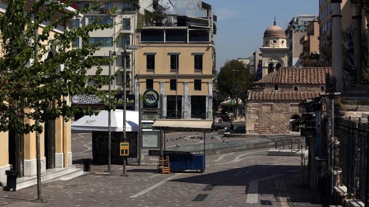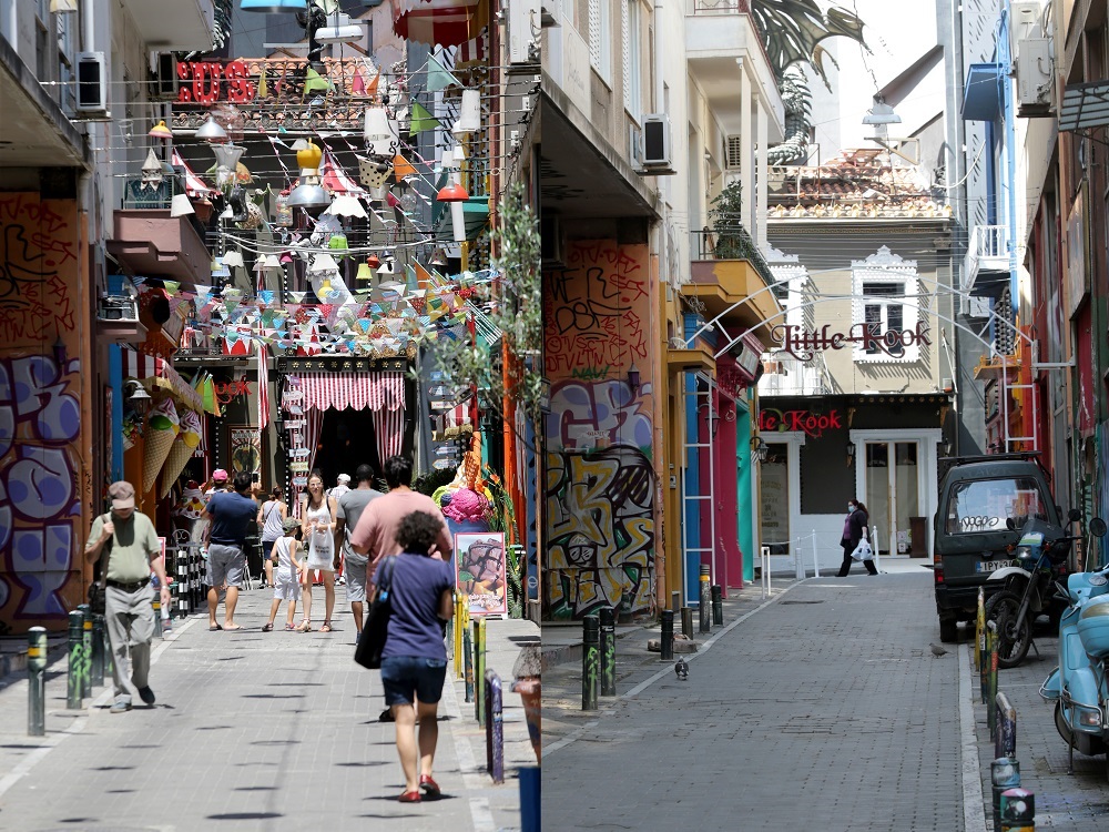 Φτάνοντας στην πλατεία Συντάγματος το σιντριβάνι είναι η πρώτη φορά που ακούγεται τόσο καθαρά, την ίδια ώρα που κάποιοι άνθρωποι δίχως στέγη κοιμούνται στα παγκάκια. Οι Εύζωνες μπροστά από τη Βουλή δεν έχουν κοινό να παρακολουθήσει την αλλαγή φρουράς, που άλλοτε αυτή την περίοδο συγκέντρωνε τα βλέμματα τουριστών και όχι μόνο. Διασχίζοντας τον πιο εμπορικό δρόμο του κέντρου της Αθήνας, την Ερμού, η εικόνα θυμίζει Δεκαπενταύγουστο. Κλειστές βιτρίνες καταστημάτων, που λίγο πριν το Πάσχα θα ήταν γεμάτα από κόσμο, ο οποίος θα έκανε τα ψώνια του για τις ημέρες των γιορτών. Σε μια βιτρίνα υπάρχει η πινακίδα «είμαστε κλειστά, μένουμε σπίτι, για το καλό όλων μας», υπενθυμίζοντας για ακόμη μία φορά την κατάσταση που επικρατεί.