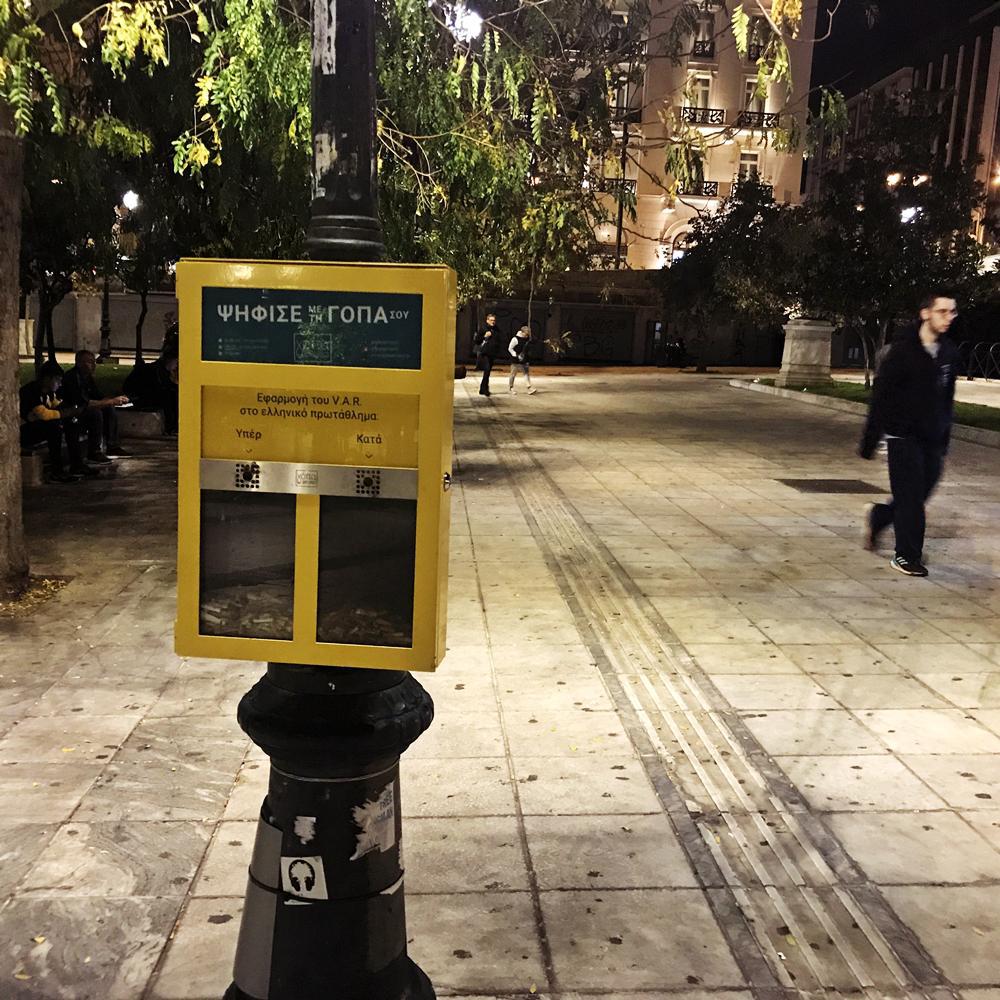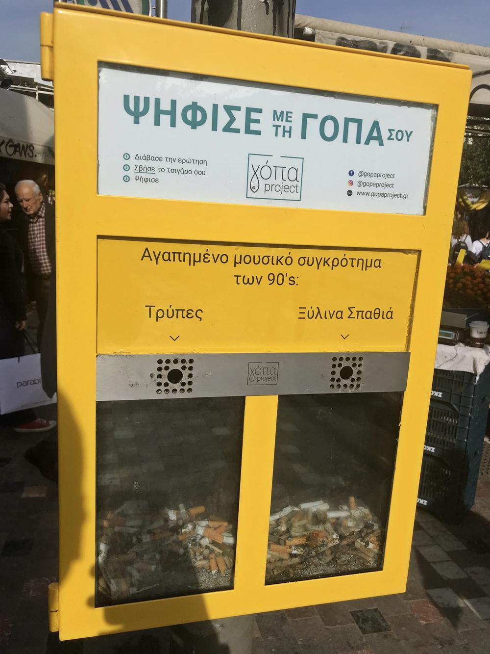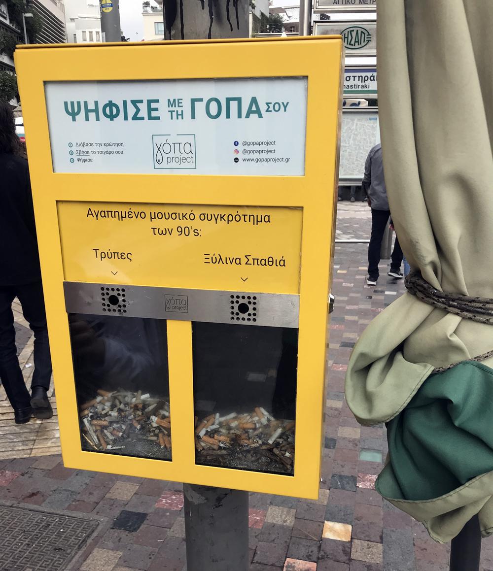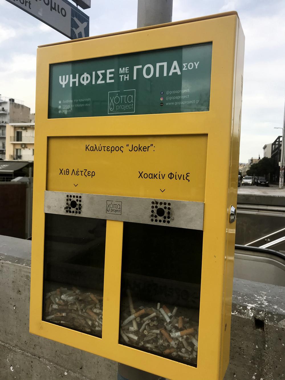 Στο κέντρο της Αθήνας, μια παρέα ανθρώπων δημιούργησε το Γόπα Project και παροτρύνει όσους καπνίζουν να χρησιμοποιήσουν τη γόπα ως ψηφοδέλτιο και να ψηφίζουν.