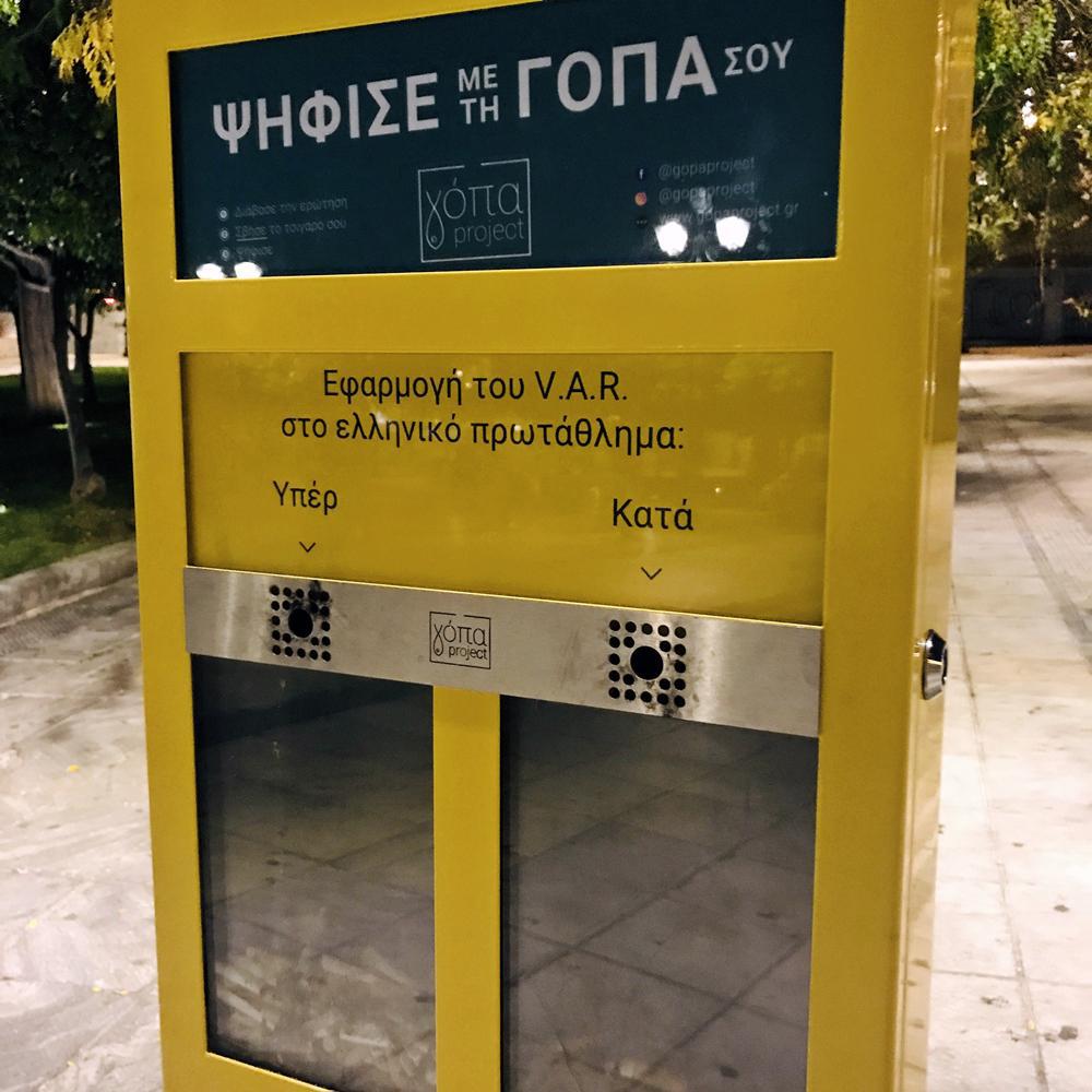 Το Γόπα Project ξεκίνησε πριν από μερικούς μήνες στο κέντρο της Αθήνας, με την τοποθέτηση σταχτοδοχείων με μορφή κάλπης, πάνω από τα οποία βρίσκονται αναρτημένα ερωτήματα ώστε οι καπνιστές να μπορούν να ψηφίζουν με την γόπα τους. Η πρωτότυπη αυτή ιδέα έρχεται να καλύψει ένα μεγάλο κενό, την απουσία σταχτοδοχείων στους δρόμους και να παροτρύνει τους καπνιστές να μην μολύνουν την πόλη, αλλά να κάνουν τη γόπα τους χρηστική, λαμβάνοντας μέρος σε μια ψηφοφορία. Σε πολλές Ευρωπαϊκές πόλεις, όπου η γόπα αποτελεί καθημερινό πονοκέφαλο ως το πιο μικρό, το πιο τοξικό και συχνό σκουπίδι, έχουν δημιουργηθεί παρόμοια εγχειρήματα όπου παροτρύνονται οι καπνιστές να ανακυκλώνουν τις γόπες τους, δημιουργώντας μ’ αυτές ακόμα και έργα τέχνης.
