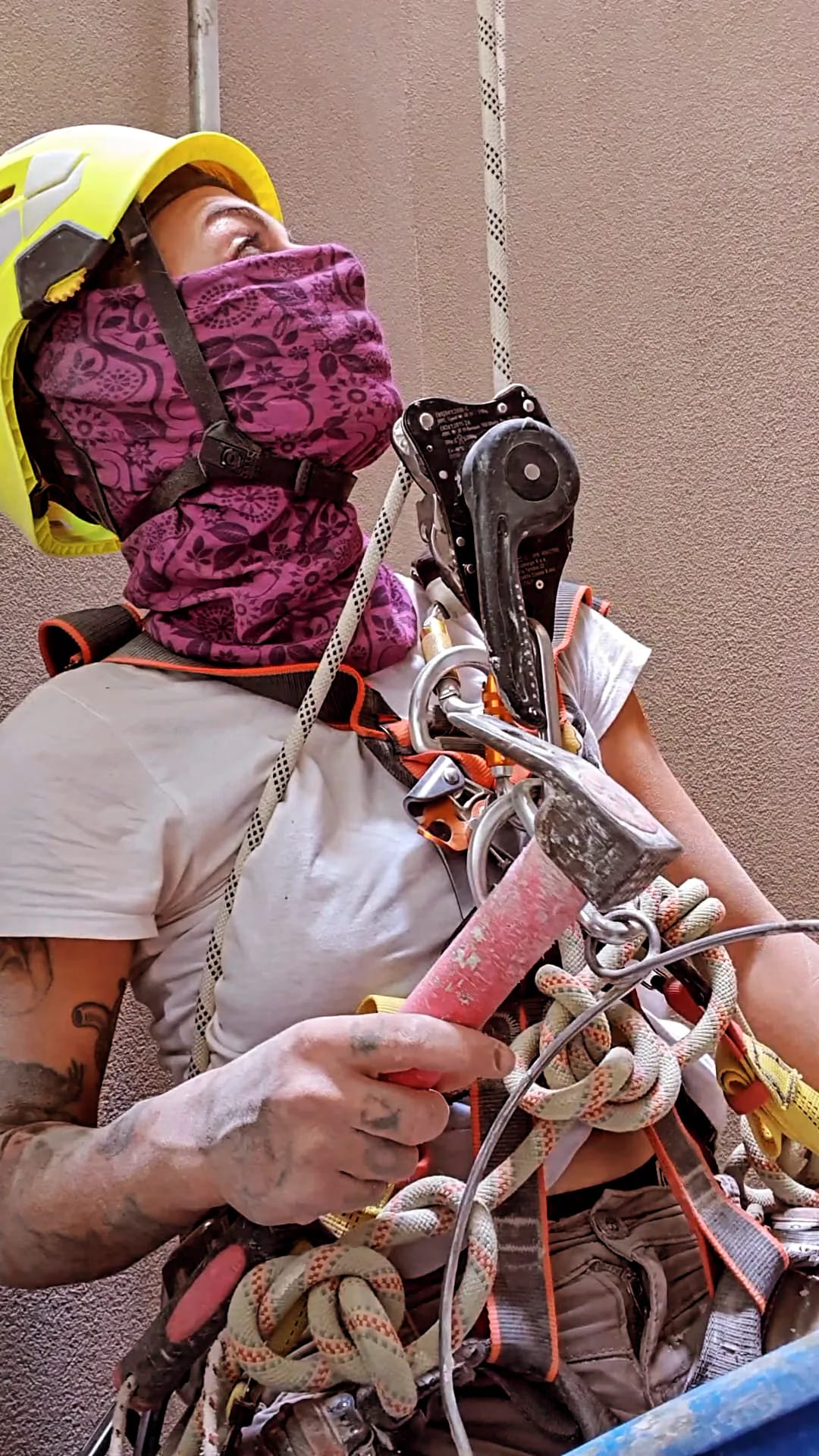 «Υπάρχει καταπόνηση του σώματος διότι δεν υπάρχουν προδιαγραφές στα κτίρια για εργασίες με σχοινιά. Έτσι πολλές φορές η θέση εργασίας είναι όχι απλώς άβολη αλλά και επίπονη. Υπάρχουν δουλειές που όταν τις παραδίδω, δίνω στον εαυτό μου μετά μία βδομάδα για να ξεκουραστώ. Σαν γυναίκα πρέπει να παραδεχτώ πως υπάρχει μια παραπάνω ευαισθησία και στα θέματα υγιεινής, όλη μέρα στην σκόνη και εκτεθειμένη στις καιρικές συνθήκες ξέρω με σιγουριά πιά ότι αν δεν έχεις μεράκι για αυτό, δεν θα το επιλέξεις».