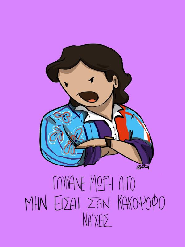 Η itzi.artz, ένα κορίτσι που μεγάλωσε με παλιές ελληνικές σειρές με αγαπημένη της την «Κωνσταντίνου και Ελένης» με όλες τις ατάκες να έχουν χαραχτεί στο μυαλό της. «Η αγάπη μου για αυτή την σειρά προδίδεται σχεδόν στο κάθε σχέδιο που φτιάχνω, αφού τα περισσότερα από αυτά έχουν αναφορές και ατάκες από την σειρά.»
