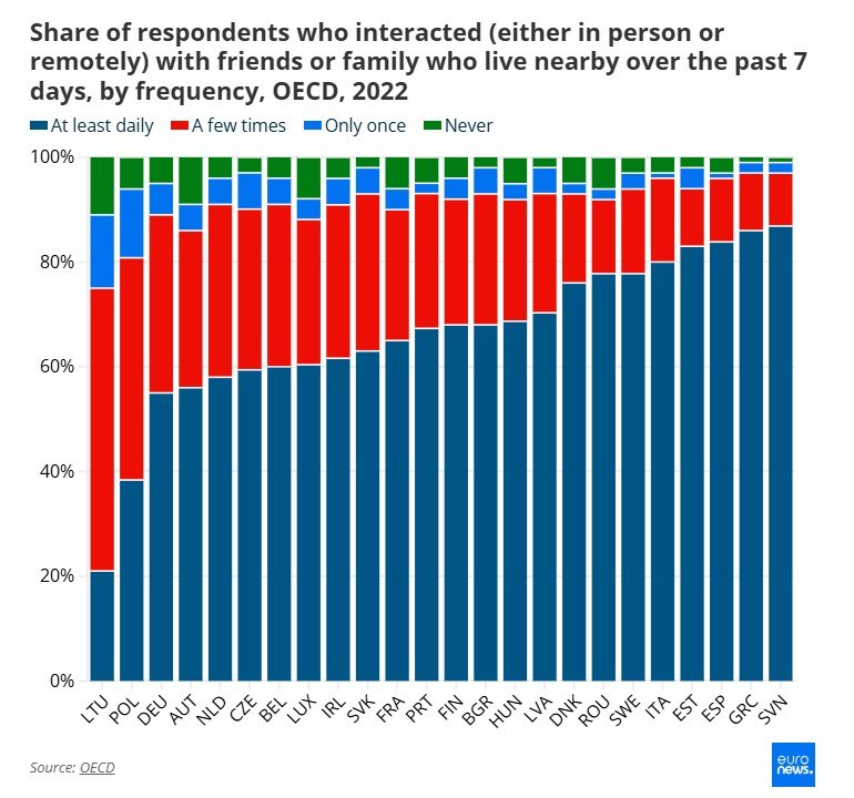 Αντίθετα, η Λιθουανία έχει το υψηλότερο ποσοστό ερωτηθέντων που δεν έχουν αλληλεπιδράσει (είτε αυτοπροσώπως είτε εξ αποστάσεως) με φίλους ή συγγενείς οι οποίοι ζουν κοντά, τις τελευταίες επτά ημέρες.