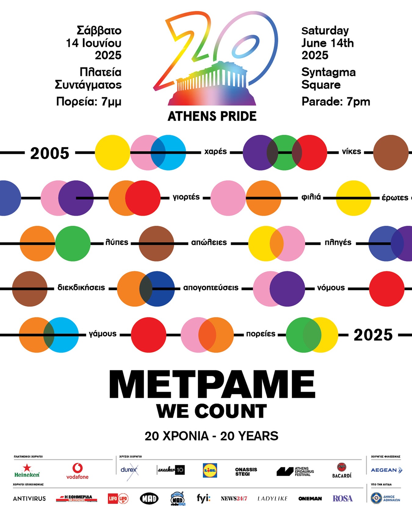 Με σύνθημα «Είκοσι χρόνια και μετράμε» θα γιορτάσει την επέτειο των 20 χρόνων το Athens Pride. Στην αφίσα του ένα αριθμητήριο (άβακας) που στην κορυφή του έχει την ημερομηνία 2005 ενώ στην τελευταία σειρά το 2025 γεμίζει με ενδιάμεσους πολύχρωμους κύκλους (σταθμούς) με λέξεις κλειδιά όπως νίκες, χαρές, λύπες, απώλειες, πληγές, διεκδικήσεις, νόμοι, γάμος ,πορείες.
