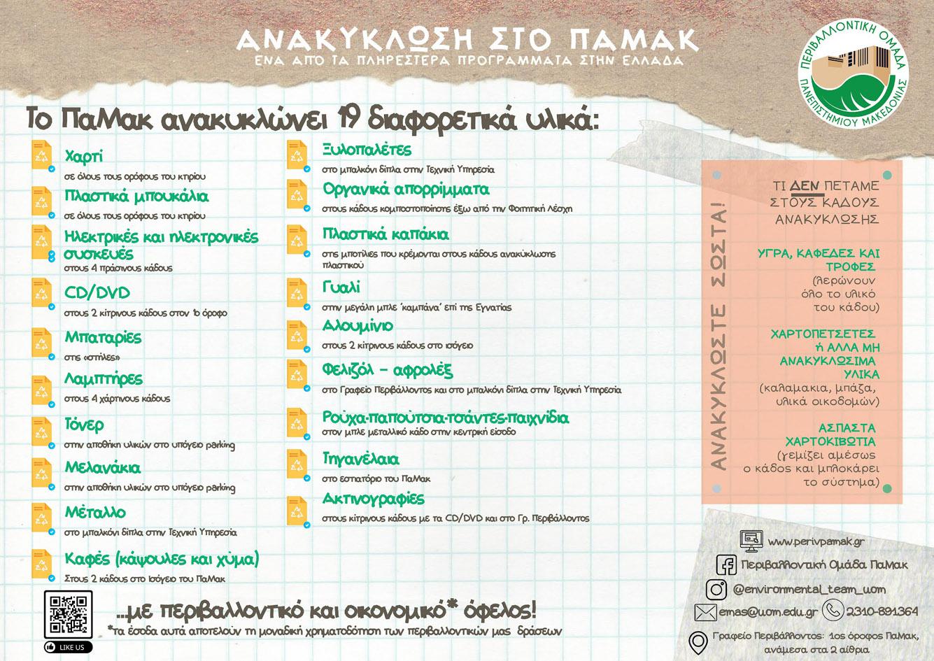 Για περισσότερες πληροφορίες σχετικά με το πρόγραμμα ανακύκλωσης του Πανεπιστημίου Μακεδονίας οι ενδιαφερόμενοι μπορούν να επισκέπτονται την ιστοσελίδα του Γραφείου Περιβάλλοντος πιέζοντας εδώ, ή την σελίδα της Περιβαλλοντικής Ομάδας στο FB, πιέζοντας εδώ.https://parallaximag.gr/epikairotita/thessaloniki-kathistiki-kai-podilatiki-diamartyria-gia-tin-katastasi-stous-dromous