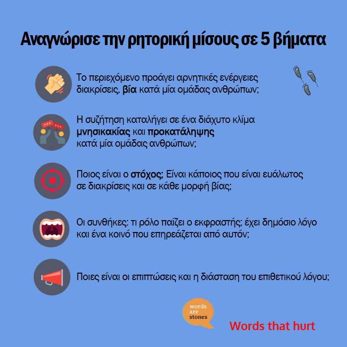 Η ρητορική μίσους, είναι η λεκτική επίθεση που προσβάλλει ένα άτομο ή μια ομάδα με βάση χαρακτηριστικά όπως το φύλο, την εθνοτική καταγωγή, τη θρησκεία, τη φυλή, την αναπηρία τον σεξουαλικό προσανατολισμό. Είναι ένα φαινόμενο που συναντάμε παντού. Στα ΜΜΕ, στο διαδίκτυο, στην καθημερινή μας συναλλαγή σε υπηρεσίες, στα μέσα μαζικής μεταφοράς. Σε ορισμένες χώρες η ρητορική μίσους διώκεται από τον νόμο αλλά σε κάθε περίπτωση είναι δύσκολο να αποδειχτεί και να καταδικαστεί. Στόχος της καμπάνιας Words Are Stones είναι η εξάλειψη της ρητορικής μίσους μέσα από την ενημέρωση και την ευαισθητοποίηση πολιτών.