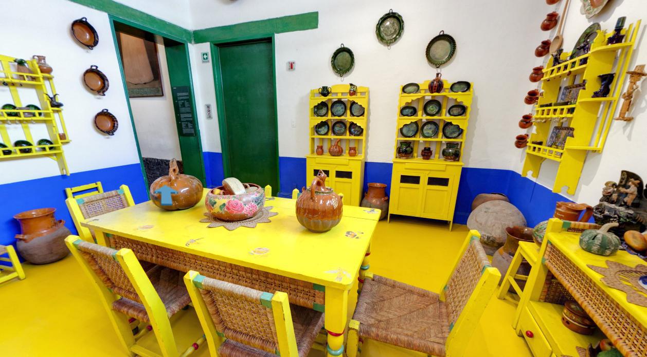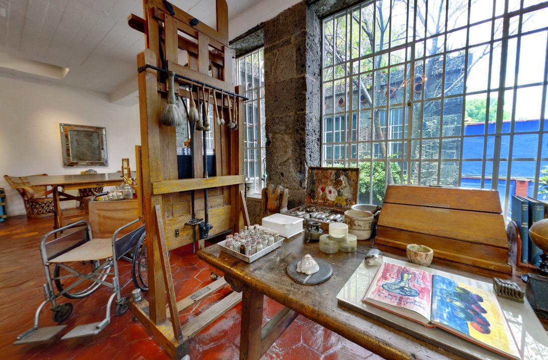 Την προσοχή τραβά η σε ζωηρό κίτρινο χρώμα κουζίνα και κουζινοτράπεζο της Κάλο, όπου η ίδια και ο Ριμπέρα περνούσαν κάποιες ώρες με τον Λέον Τρότσκι, ο οποίος ήταν κοντινός γείτονάς τους (και με τον οποίο, η Φρίντα είχε μια σύντομη σχέση). Στο διπλανό δωμάτιο, το ατελιέ της Κάλο, με το καβαλέτο της και γεμάτο πίνακές της. (Πηγή: ΑΠΕ)