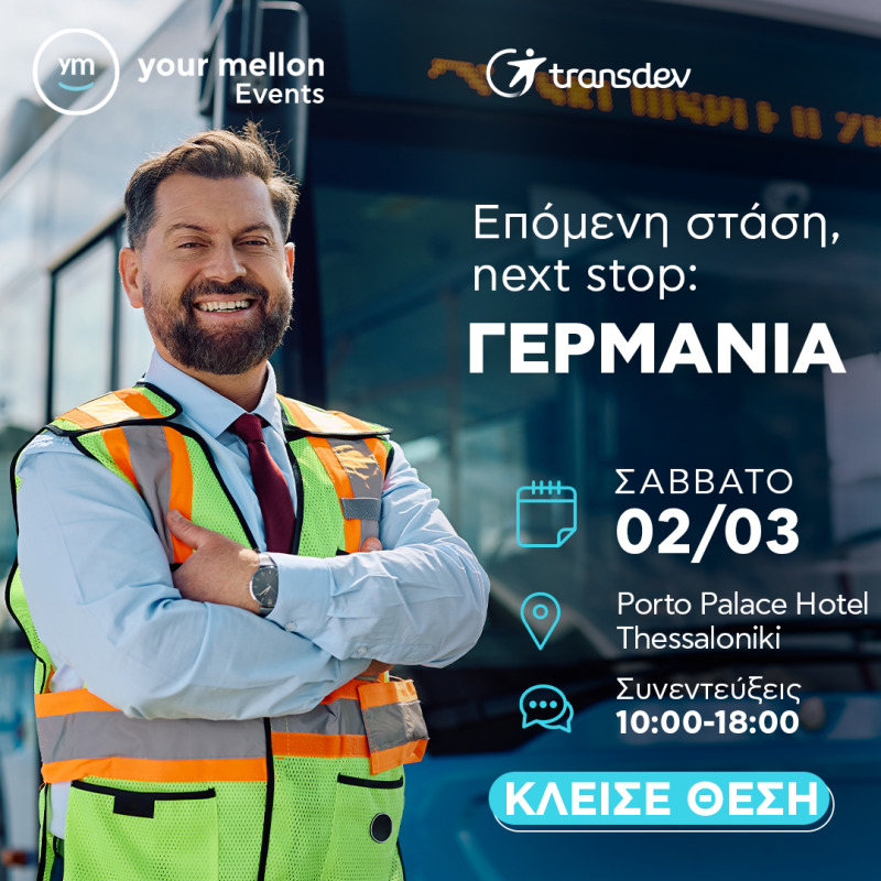 Τη δυνατότητα εύρεσης εργασίας στη γερμανική εταιρεία μέσων μαζικής μεταφοράς Transdev GmbH θα έχουν οι επαγγελματίες οδηγοί λεωφορείου, που αναζητούν ευκαιρίες απασχόλησης στο εξωτερικό, στο πλαίσιο της εκδήλωσης «Your Mellon Events» το Σάββατο 2 Μαρτίου στη Θεσσαλονίκη.