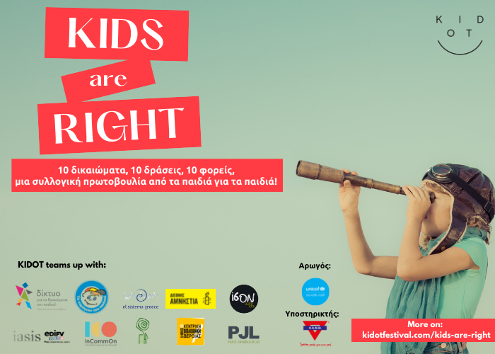 Στο πλαίσιο του “KIDS are RIGHT”, το KIDOT σε συνεργασία με 10 φορείς, διοργανώνει 10 βιωματικές δράσεις με ελεύθερη είσοδο και στόχο την ενημέρωση και την ευαισθητοποίηση των παιδιών για τα δικαιώματα τους, αλλά και την κινητοποίηση μικρών και μεγάλων για δράση.