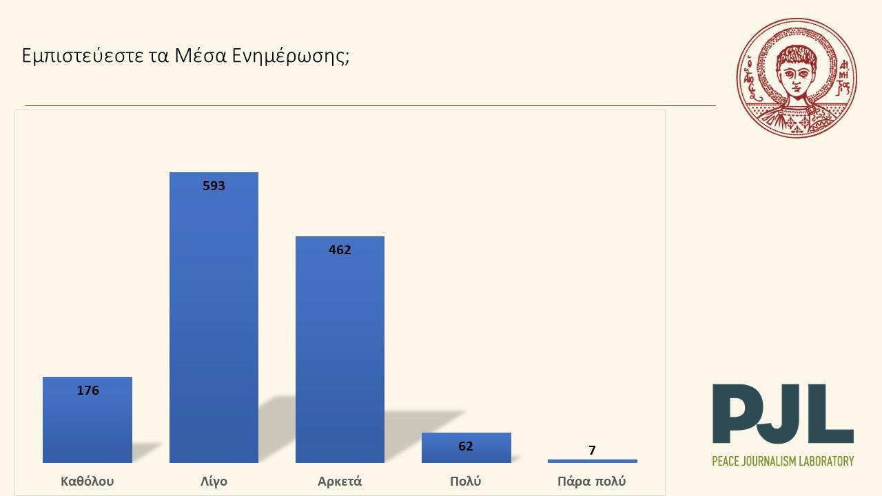Η ανάκτηση της εμπιστοσύνης των πολιτών αναδεικνύεται σε μείζον διακύβευμα για τα ΜΜΕ την περίοδο αυτή. Από τους 1.300 ερωτηθέντες οι 769 δηλώνουν ότι εμπιστεύονται λίγο έως καθόλου τα ΜΜΕ, οι 524 από αρκετά έως πολύ και μόλις 7 πάρα πολύ.