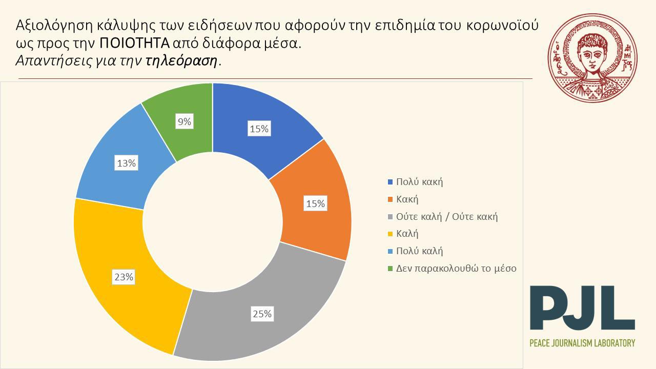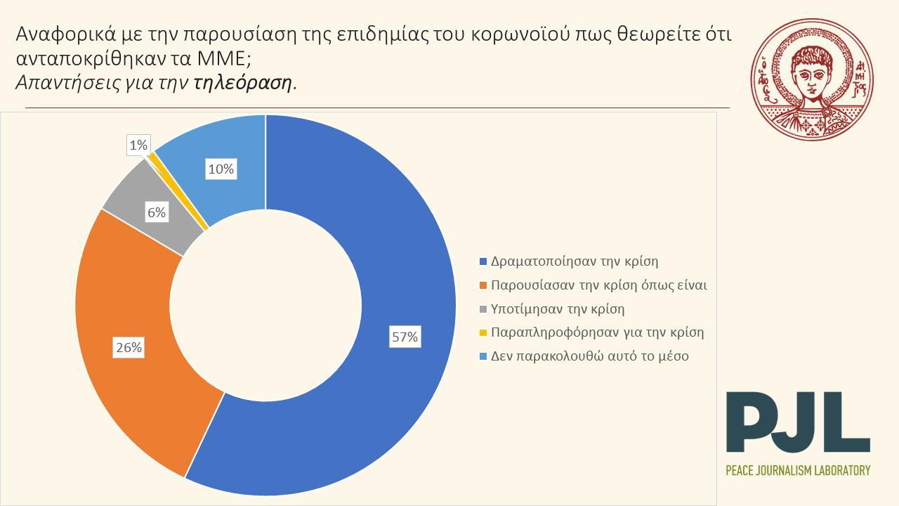 Όπως προκύπτει από έρευνα κοινής γνώμης, που διενήργησε σε δείγμα 1.300 ατόμων το Εργαστήριο Διεθνούς και Ειρηνευτικής Δημοσιογραφίας (IPJ Lab) του Τμήματος Δημοσιογραφίας και ΜΜΕ του Αριστοτελείου Πανεπιστημίου Θεσσαλονίκης (ΑΠΘ) και παρουσιάζει το Αθηναϊκό και Μακεδονικό Πρακτορείο Ειδήσεων, οι πολίτες στρέφονται στα παραδοσιακά ΜΜΕ, για να ενημερωθούν σχετικά με τις εξελίξεις που αφορούν την πανδημία του SARS-CoV-2.