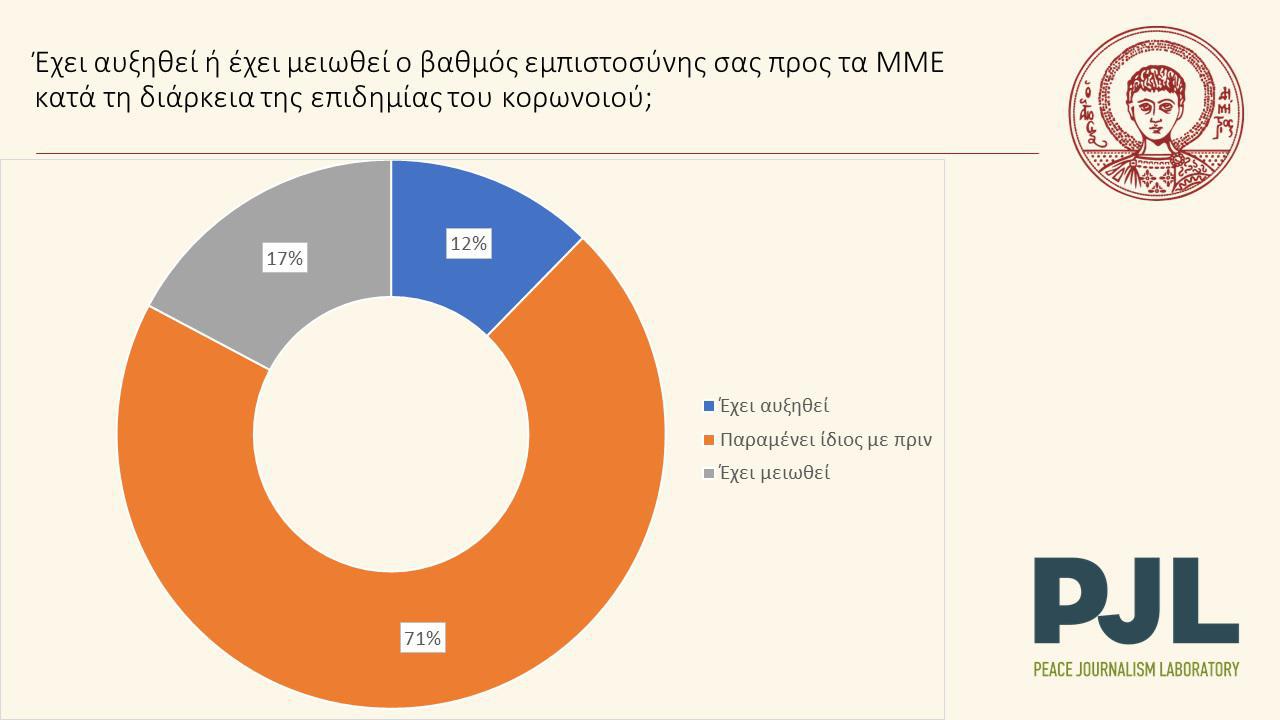 Μια θετική ανάγνωση των στοιχείων θα μπορούσε να είναι πως υπάρχει πεδίον δόξης λαμπρό, για να αντιστραφεί αυτή η δυσπιστία, καθώς το 71% δηλώνει πως ο βαθμός εμπιστοσύνης του προς τα ΜΜΕ δεν έχει διαφοροποιηθεί στη διάρκεια της κάλυψης της επιδημίας, ενώ έχει αυξηθεί για το 12% και έχει μειωθεί για το 17%.