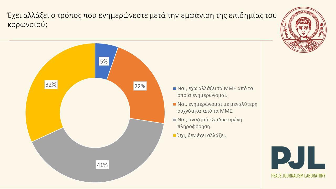 Η στροφή των πολιτών στα παραδοσιακά ΜΜΕ αποτυπώνεται στο σχετικό ερώτημα για τον τρόπο ενημέρωσής τους μετά την εμφάνιση της επιδημίας. Το 41% δηλώνει πως έχει αλλάξει τρόπο ενημέρωσης και αναζητεί εξειδικευμένη πληροφόρηση, έναντι 32% που δεν έχει αλλάξει. Το 22% ενημερώνεται με μεγαλύτερη συχνότητα από τα ΜΜΕ και 5% δηλώνει πως έχει αλλάξει τα ΜΜΕ από τα οποία ενημερώνεται.