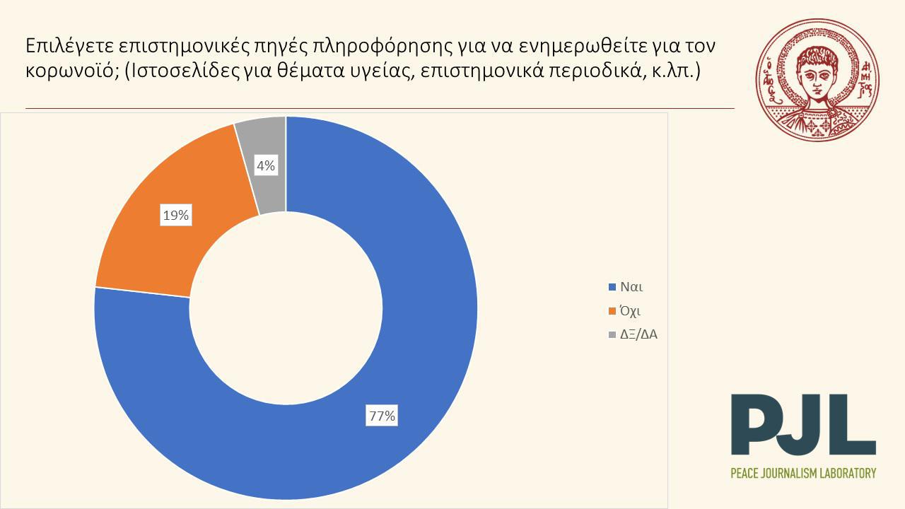 Ταυτόχρονα προκύπτει ότι η κοινή γνώμη σε τέτοιες συνθήκες αναζητά σοβαρή, υπεύθυνη και αξιόπιστη ενημέρωση καθώς ένα μεγάλο ποσοστό έχει δει ή λάβει, ακούσει ψευδείς ειδήσεις, ενώ όπως προκύπτει από την έρευνα μας αλλά και διαπιστώνεται από άλλες στο εξωτερικό είναι η έμφαση/ζήτηση για επιστημονικές πηγές».