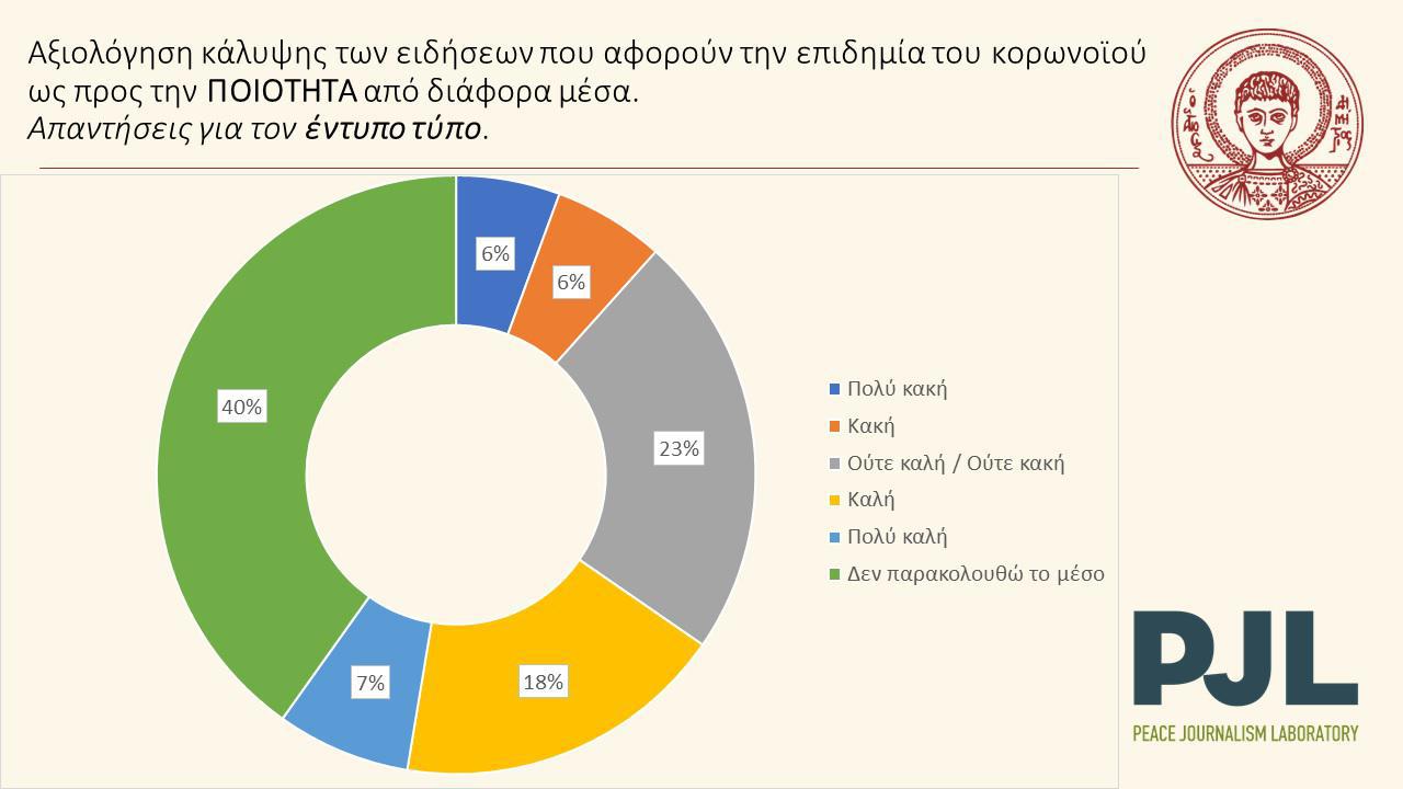 «Τα αποτελέσματα της έρευνας υπογραμμίζουν την αναγκαιότητα της τεκμηριωμένης δημοσιογραφικής κάλυψης, που θα απαντά στον φθηνό εντυπωσιασμό, αλλά θα είναι και ουσιαστικός σύμμαχος των πολιτών», σχολιάζει ο αν. Καθηγητής του ίδιου Τμήματος του ΑΠΘ Νίκος Παναγιώτου και παρατηρεί ότι «μεγάλη έμφαση έχει δοθεί στην παραπληροφόρηση, όμως ελάχιστα έχει υπογραμμιστεί ο κίνδυνος της υπερπληροφόρησης, που οδηγεί πολλούς πολίτες στο να αποφεύγουν να ενημερωθούν, αισθανόμενοι ότι δεν καταλαβαίνουν το θέμα ή το κυριότερο δεν τους βοηθά καθόλου στην προσπάθεια να διαχειριστούν την κρίση».