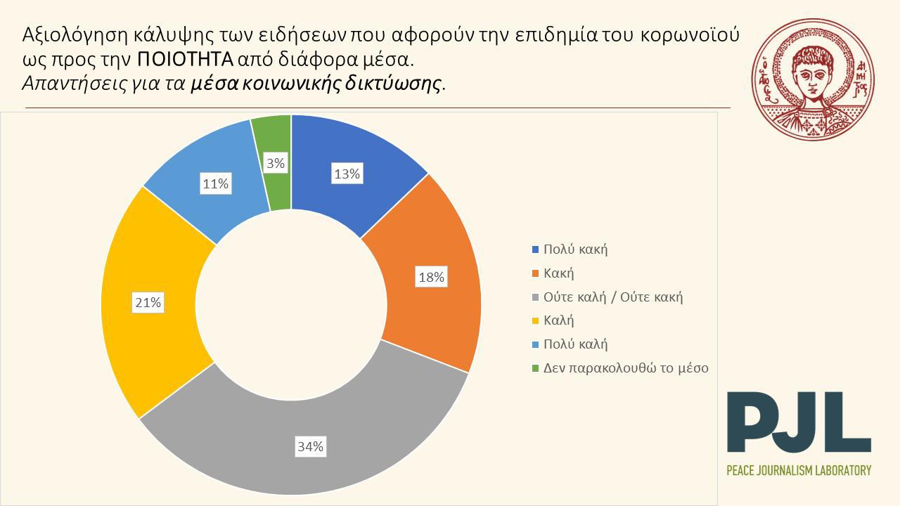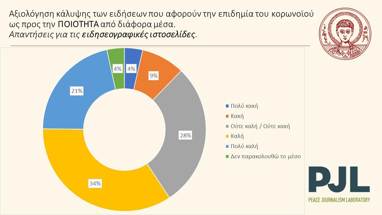 Το 77% των ερωτηθέντων αναζητεί επιστημονικές πηγές πληροφόρησης. Σε ό,τι αφορά την ποιότητα της ενημέρωσης ανά μέσο «καλή έως πολύ καλή» αξιολογείται σε ποσοστό 55% για τις ενημερωτικές ιστοσελίδες, 36% για την τηλεόραση, 32% για το ραδιόφωνο, όπως και για τα μέσα κοινωνικής δικτύωσης και 25% για τα έντυπα μέσα. Αντίθετα οι ερωτηθέντες θεωρούν «κακή έως πολύ κακή» την ποιότητα της ενημέρωσης από τα μέσα κοινωνικής δικτύωσης κατά 31%, την τηλεόραση σε ποσοστό 30%, τα έντυπα μέσα σε ποσοστό 12%, τις ιστοσελίδες κατά 13% και το ραδιόφωνο 9%.