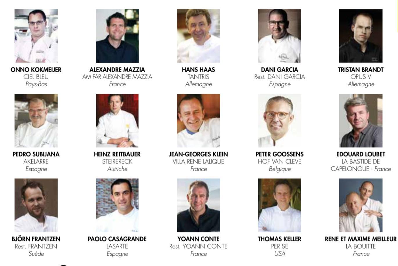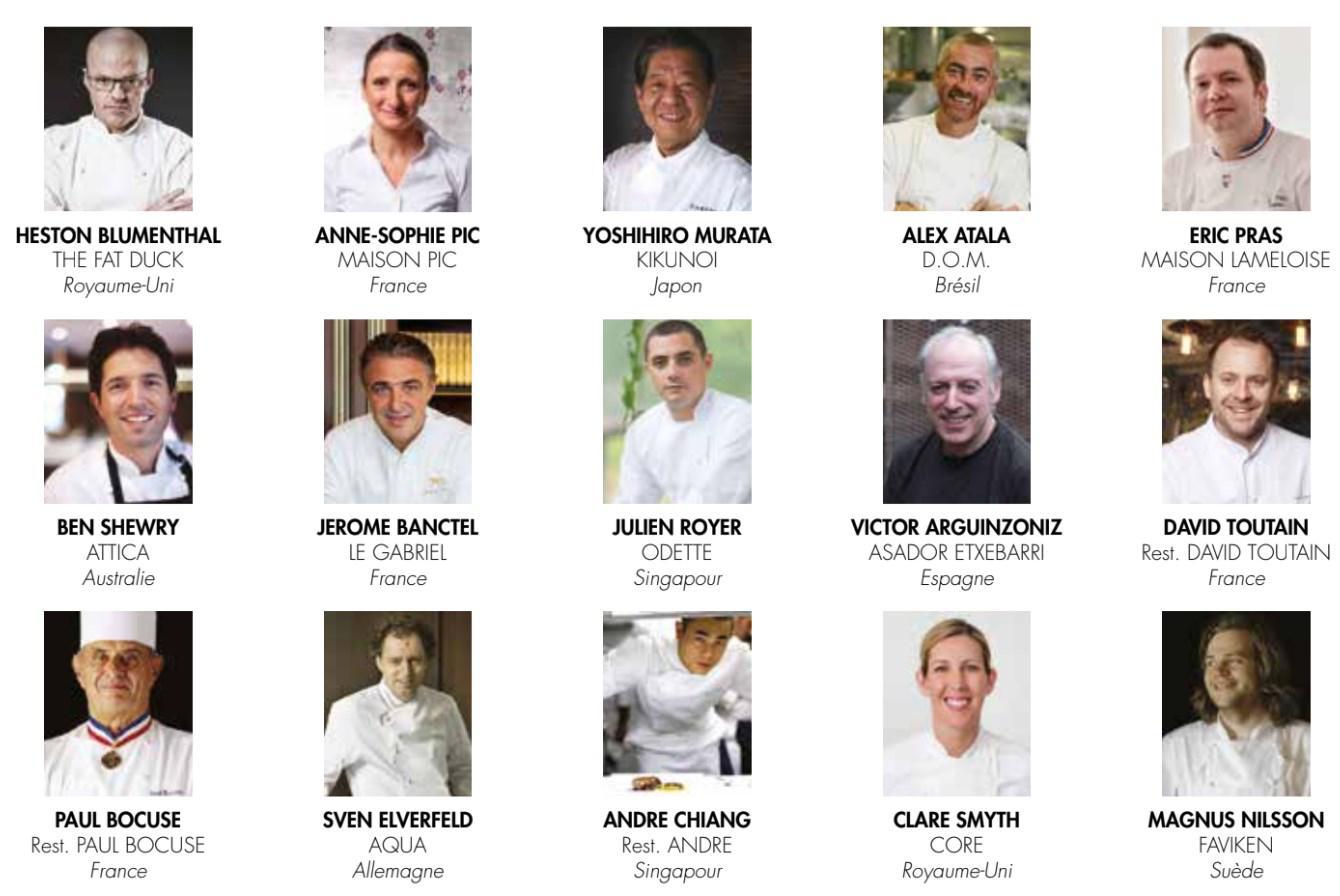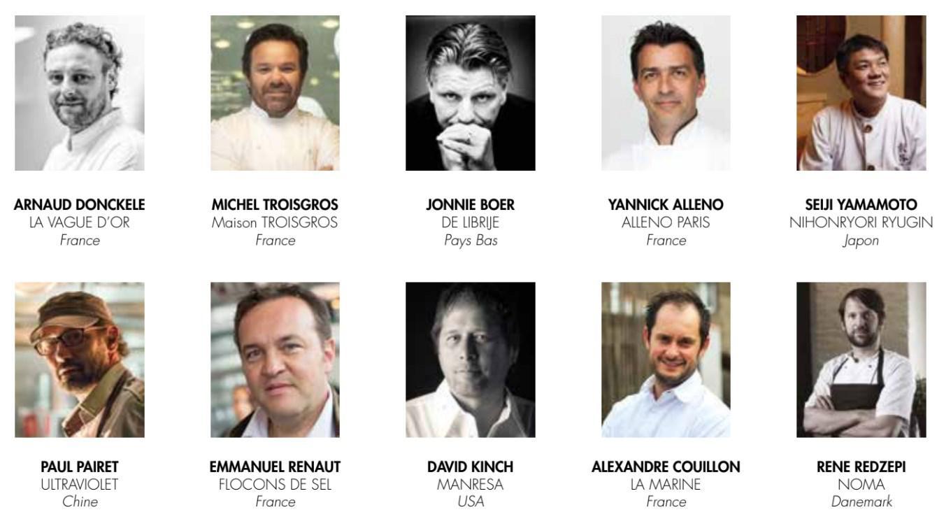 1. Arnaud Donckele – Residence De La Pinede (Saint Tropez, France) 2. Michel Troisgros – Maison Troisgros Restaurant (Ouches, France) 3. Jonnie Boer – De Librije (Netherlands) 4. Yannick Alleno – Alleno Paris (Paris, France) 5. Seiji Yamamoto – Nihonryori Ryugin (Tokyo, Japan) 6. Paul Pairet – Ultraviolet (China) 7. Emmanuel Renaut – Flocons De Sel (Megève, France) 8. David Kinch – Manresa (California, United States) 9. Alexandre Couillon – La Marine (France) 10. Rene Redzepi – Noma (Copenhagen, Denmark)