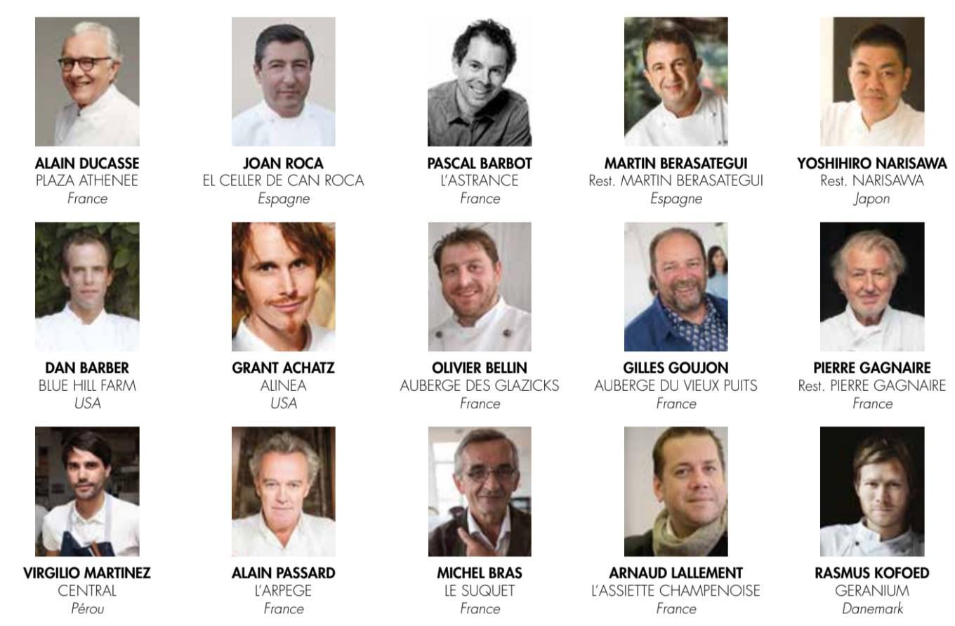 11. Alain Ducasse – France 12. Joan Roca – Spain 13. Pascal Barbot – France 14. Martin Bergasategui – Spain 15. Yoshihiro Narisawa – Japan 16. Dan Barber – USA 17. Grant Achatz – USA 18. Olivier Bellin – France 19. Gilles Goujon – France 20. Pierre Gagnaire – France 21. Virgilo Martinez – Peru 22. Alain Passard – France 23. Michel Bras – France 24. Arnaud Lallement – France 25. Rasmus Koford – Denmark