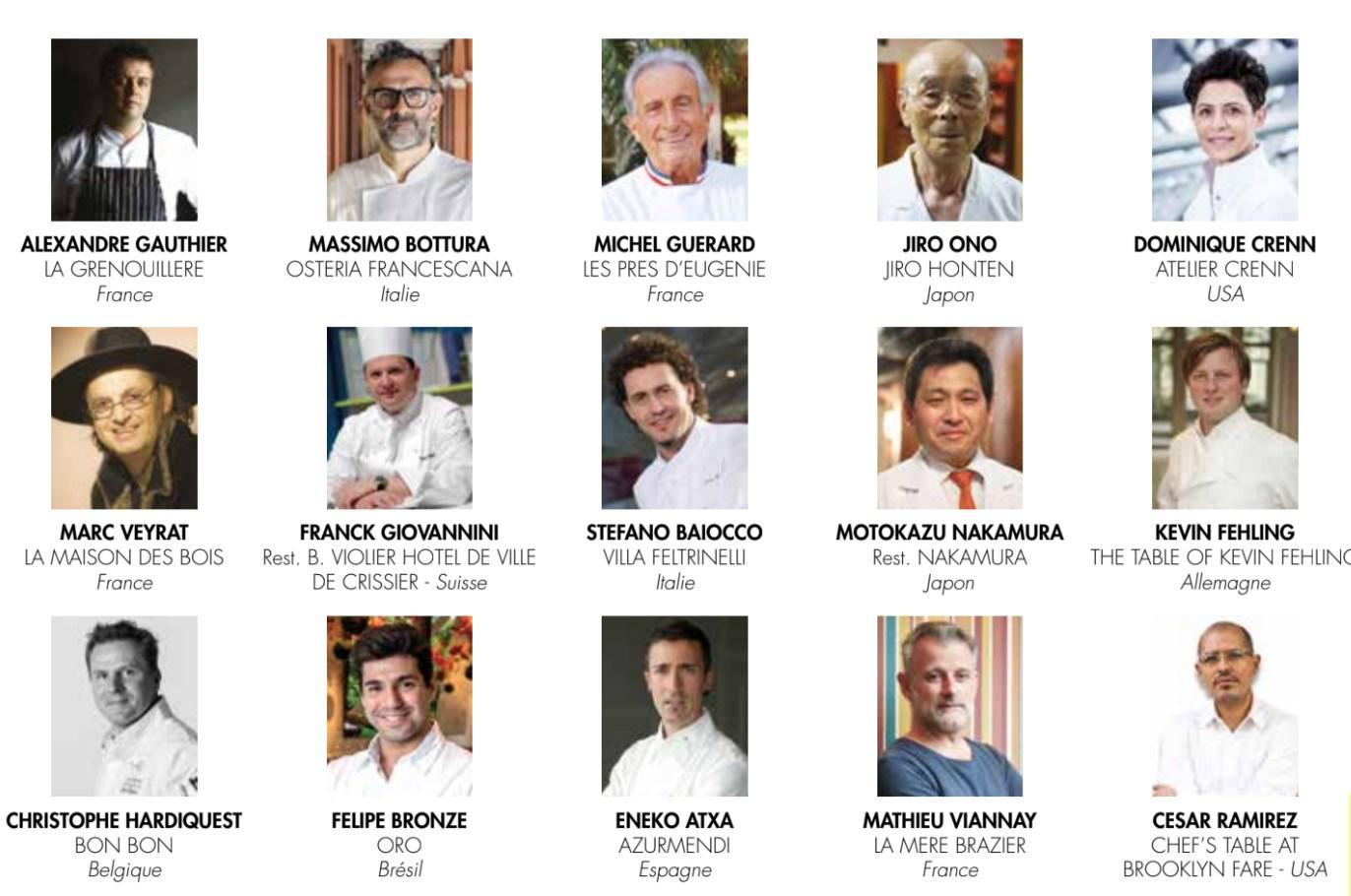 56. Alexandre Gauthier – France 57. Massimo Bottura – Italy 58. Michel Guérard – France 59. Jiro Ono – Japan 60. Dominique Crenn – United States 61. Marc Veyrat – France 62. Franck Giovannini – Switzerland 63. Stefano Baiocco – Italy 64. Motokazu Nakamura – Japan 65. Kevin Felhing – Germany 66. Christophe Hardiquest – Belgium 67. Felipe Bronze – Brazil 68. Eneko Atxa – Spain 69. Matthieu Viannay – France 70. Cesar Ramirez – United States