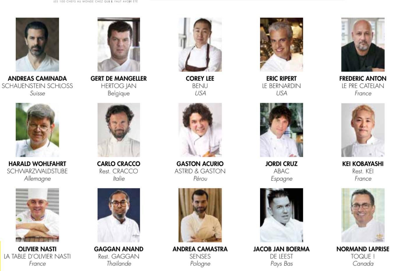 86 Andreas Caminada – Switzerland 87. Gert de Mangeller – Belgium 88. Corey Lee – Usa 89. Eric Ripert – Usa 90. Frederic Anton – France 91. Harald Wohlfart – Germany 92. Carlo Cracco – Italy 93. Gaston Acurio – Peru 94. Jordi Cruz – Spain 95. Kei Kobayashi – France 96. Olivier Nasti – France 97. Gaggan Anand – Thailand 98. Andrea Camastra – Poland 99. Jacob Jan Boerma – Netherlands 100. Normand Laprise – Canada