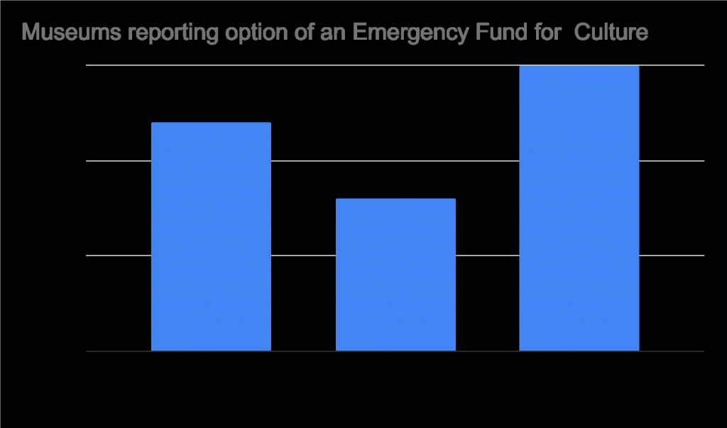 • Όσον αφορά τις εναλλακτικές πηγές εισοδήματος, πολλά μουσεία αναφέρουν την τρέχουσα ή μελλοντική πρόσβαση σε εθνικά προγράμματα χρηματοδότησης έκτακτης ανάγκης corona. Αυτά περιλαμβάνουν κυρίως την κάλυψη των μισθών ή/και των χαμένων εισοδημάτων. • Μουσεία από 12 χώρες αναφέρουν ότι βρίσκονται σε εξέλιξη συζητήσεις για ένα ταμείο επείγουσας κουλτούρας, μουσεία από 8 χώρες αναφέρουν ότι το ταμείο έκτακτης ανάγκης έχει ήδη τεθεί σε εφαρμογή, ενώ μουσεία από 15 χώρες δηλώνουν ότι δεν υπάρχει διαθέσιμο πρόγραμμα χρηματοδότησης έκτακτης ανάγκης στη χώρα τους.