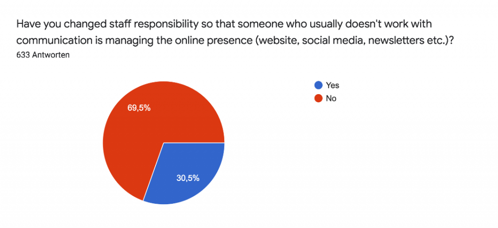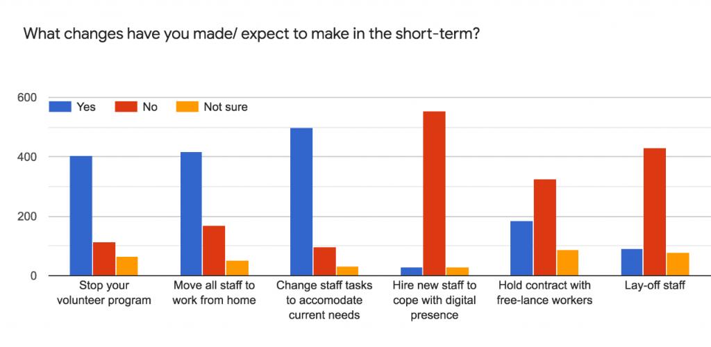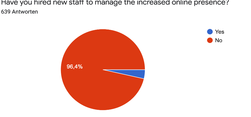 - Τα καλά νέα είναι ότι η πλειοψηφία των μουσείων δεν χρειάστηκε ακόμα να απολύσει προσωπικό. Περίπου το 70% των μουσείων αναφέρουν ότι έχουν αλλάξει καθήκοντα προσωπικού για να ικανοποιήσουν τις τρέχουσες ανάγκες.