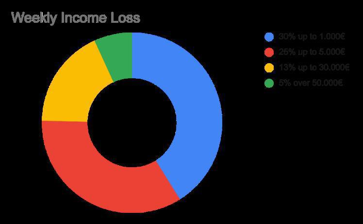 - Από τα μουσεία που παρέχουν στοιχεία, το 30% χάνει έως και 1000 ευρώ/εβδομάδα, 25% των μουσείων χάνουν μέχρι 5.000 ευρώ/ εβδομάδα, 13% χάνουν μέχρι 30.000 ευρώ/εβδομάδα, και 5% χάνουν πάνω από 50.000 ευρώ/εβδομάδα.