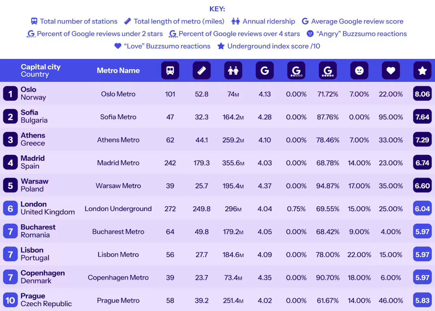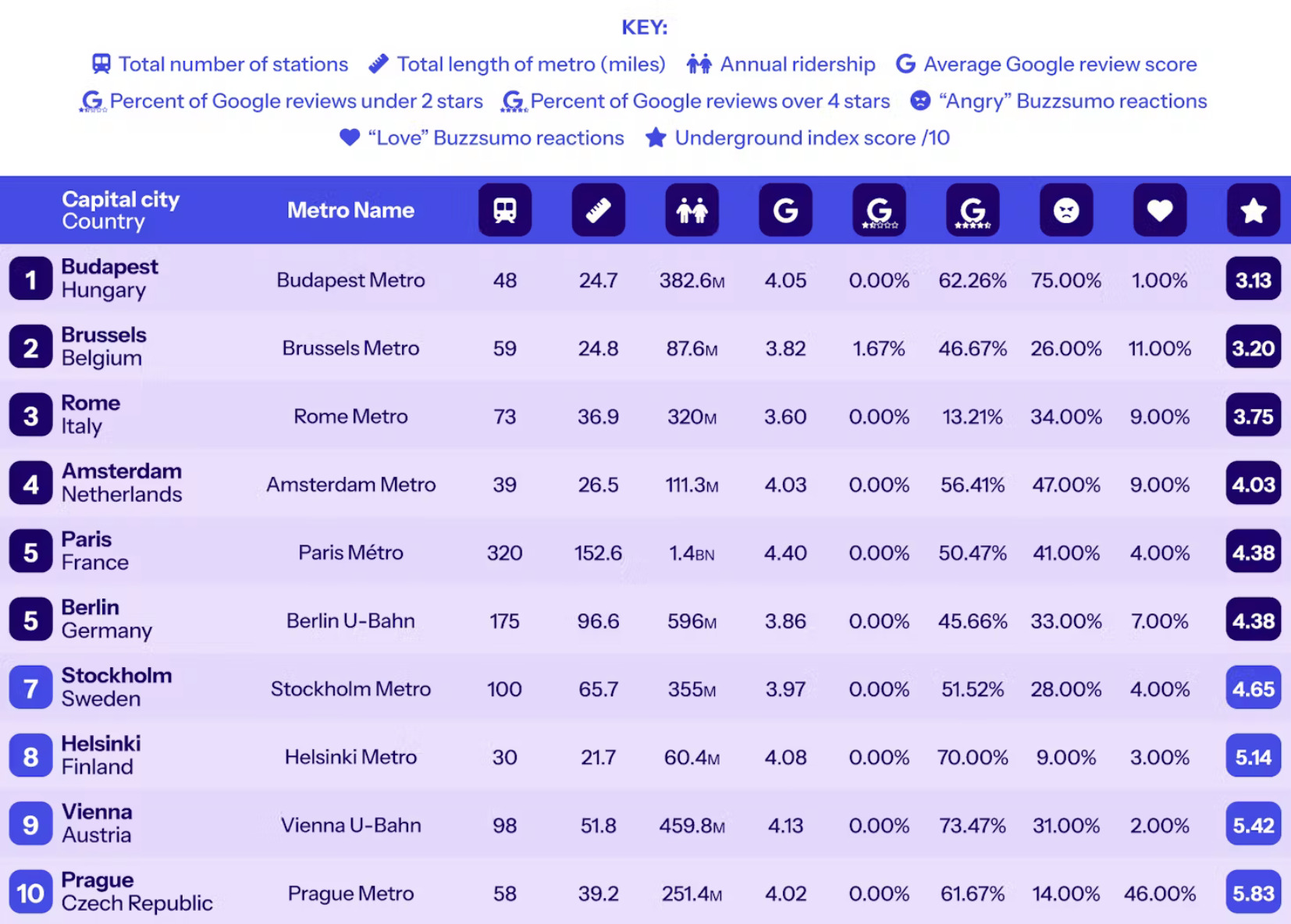 Στη συγκεκριμένη λίστα, λήφθηκαν υπόψη οι αξιολογήσεις των επιβατών, μέσω της μηχανής αναζήτησης της Google, για διαφορετικούς σταθμούς μετρό κατά μέσο όρο σε όλο το εν λόγω δίκτυο. Συνυπολογίστηκε το ποσοστό των σταθμών σε κάθε σύστημα μετρό, με βαθμολογίες κριτικών Google, με σκορ τεσσάρων αστέρων ή και περισσότερο , αλλά και τα ποσοστά χρήσης των παρακάτω μετρό και τις εμπειρίες των επιβατών.