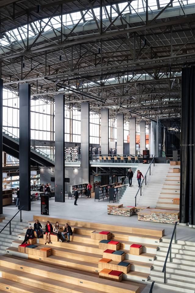 Το πρώην υπόστεγο ατμομηχανών μετατράπηκε σε έναν δημόσιο χώρο με διακριτό θέμα που έχει να κάνει με τους σιδηροδρόμους. Μετέτρεψαν μεγάλο μέρος του κομψού βιομηχανικού κτίσματος: η αίθουσα της εισόδου πήρε τη μορφή μιας στεγασμένης πλατείας, με μεγάλα τραπέζια ανάγνωσης, εκθεσιακό χώρο και καφέ.