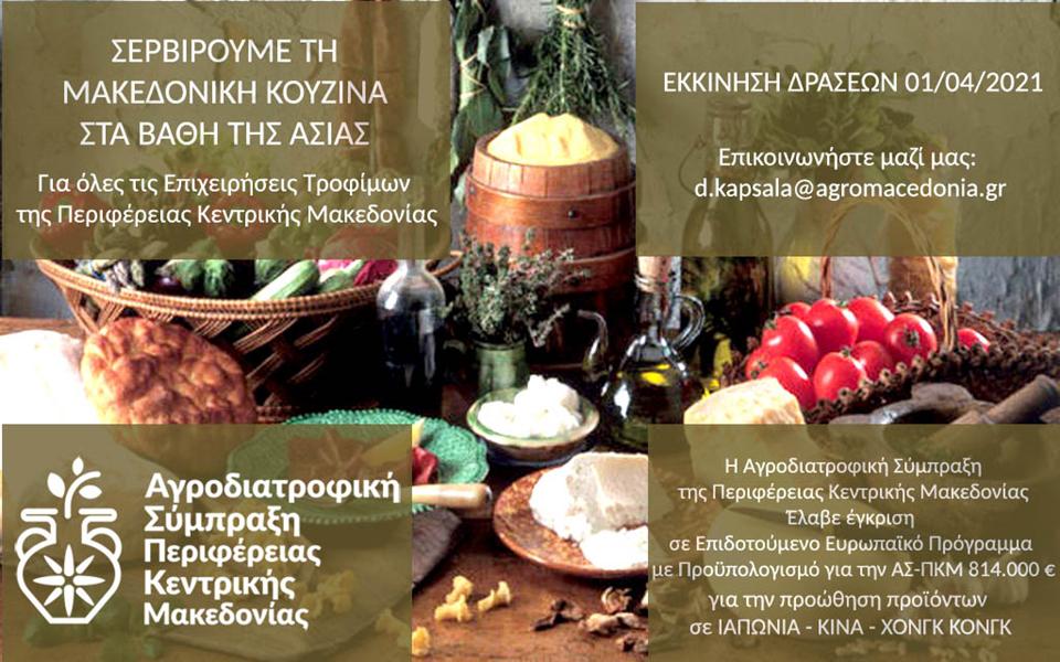 Κρασί, ξύδι, τυροκομικά προϊόντα και κυρίως κασέρι, αλλά και ελιές και λάδι από την Κεντρική Μακεδονία πρόκειται να «ταξιδέψουν» στα βάθη της Ασίας και συγκεκριμένα στην Κίνα, την Ιαπωνία και το Χονγκ – Κονγκ, με σκοπό να εντυπωσιάσουν την ασιατική αγορά τροφίμων και να διεκδικήσουν μια θέση σε αυτήν. Ήδη, επιχειρήσεις του διατροφικού χώρου από την Κεντρική Μακεδονία έχουν εκφράσει την πρόθεσή τους για συμμετοχή στις αποστολές που πρόκειται να γίνουν στο πλαίσιο του ευρωπαϊκού έργου «ExperienceEU», με σκοπό την προώθηση γεωργοδιατροφικών προϊόντων σε τρίτες χώρες.
