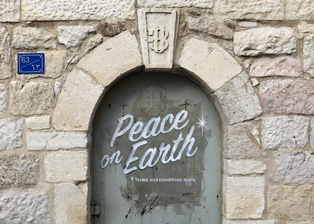 Το πρώτο από τα έργα του Banksy είναι τοποθετημένο σε μια θύρα του Καθολικού παρεκκλησίου, γνωστού ως Milk Grotto ή Grotto of Our Lady (ανεγέρθη το 1872). Το έργο φέρνει το μήνυμα «Peace on Earth» («…και επί γης ειρήνη…»). Καλά νέα για όλους μας – και όλους εκεί, ανεξαρτήτως θρησκεύματος – έως ότου διαβάσεις κανείς τα ψιλά γράμματα: Terms and conditions apply, δηλαδή «σύμφωνα με τους όρους και τις προϋποθέσεις».