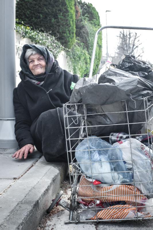 Από εκεί παίρνει παλιούς τενεκέδες τους οποίους πουλάει για να «βγάλει» τα προς το ζην. Κατά τη διάρκεια της αστικής περιοδείας της κάποιοι ελάχιστοι άνθρωποι μπορεί να της δώσουν φαγητό ή χρήματα.