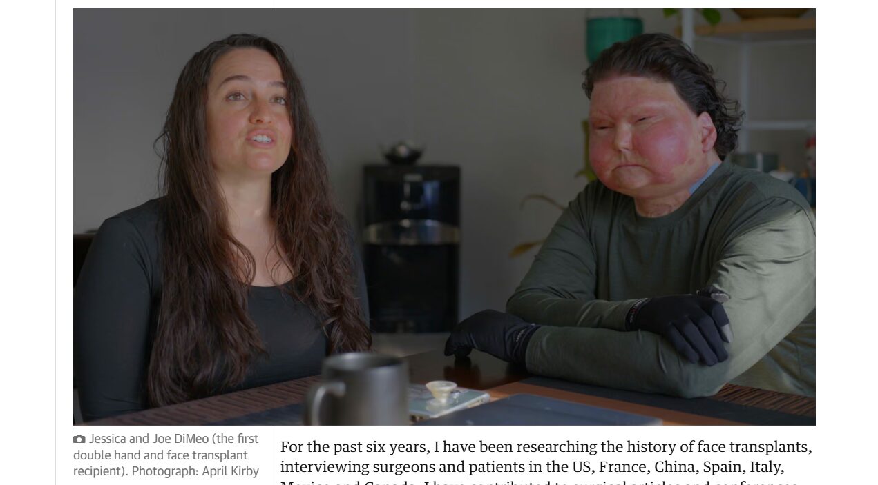 Τα τελευταία έξι χρόνια ερευνώ την ιστορία των μεταμοσχεύσεων προσώπου, παίρνοντας συνεντεύξεις από χειρουργούς και ασθενείς στις ΗΠΑ, στη Γαλλία, στην Κίνα, στην Ισπανία, στην Ιταλία, στο Μεξικό και στον Καναδά. Έχω συμβάλει σε επιστημονικά άρθρα και συνέδρια, έχω μεταφέρει τις φωνές των ασθενών στο επίκεντρο των συζητήσεων και έχω συμβουλεύσει σε μια κρίσιμη μελέτη, χρηματοδοτούμενη από το Υπουργείο Άμυνας των ΗΠΑ, με σκοπό τη ρύθμιση όλων των ειδών VCA.