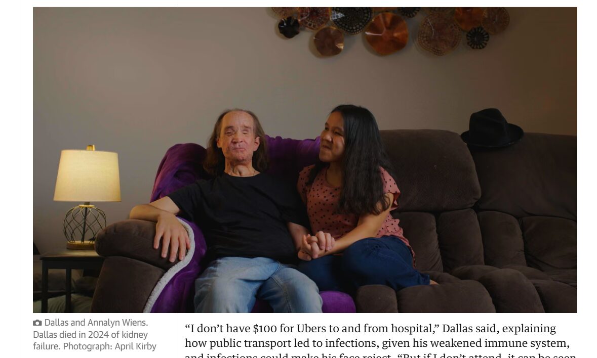 «Δεν έχω 100 δολάρια για Uber από και προς το νοσοκομείο», είπε ο Ντάλας, εξηγώντας πως τα μέσα μαζικής μεταφοράς τον εξέθεταν σε μολύνσεις, λόγω του εξασθενημένου ανοσοποιητικού του, και μια μόλυνση μπορούσε να προκαλέσει απόρριψη του μοσχεύματος. «Αλλά αν δεν πάω στα ραντεβού, μπορεί να θεωρηθεί ότι δεν συμμορφώνομαι. Είναι δίκαιο αυτό;»