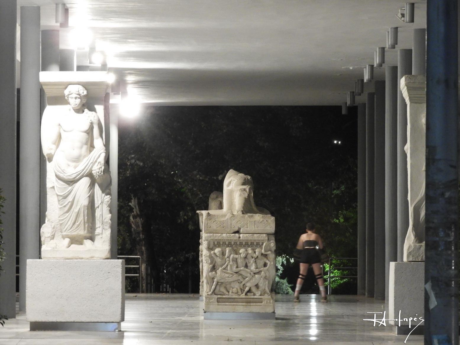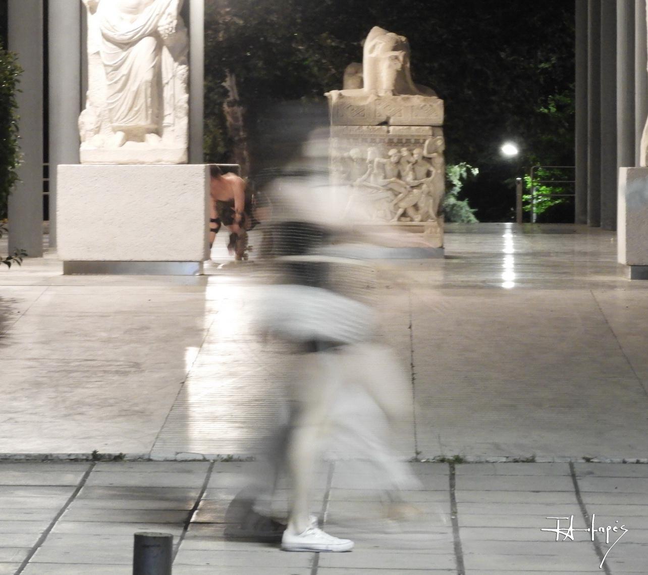 Ο Γιάννης Τζιμπρές αποτύπωσε μέσα σε τρεις εικόνες μια ενδιαφέρουσα, αισθητικά και εικαστικά, Κυριακή, στην είσοδο του Αρχαιολογικού Μουσείου Θεσσαλονίκης, όπου γνωρίζουμε ότι πολλές φορές μαζεύονται νέοι της πόλης για χορό.