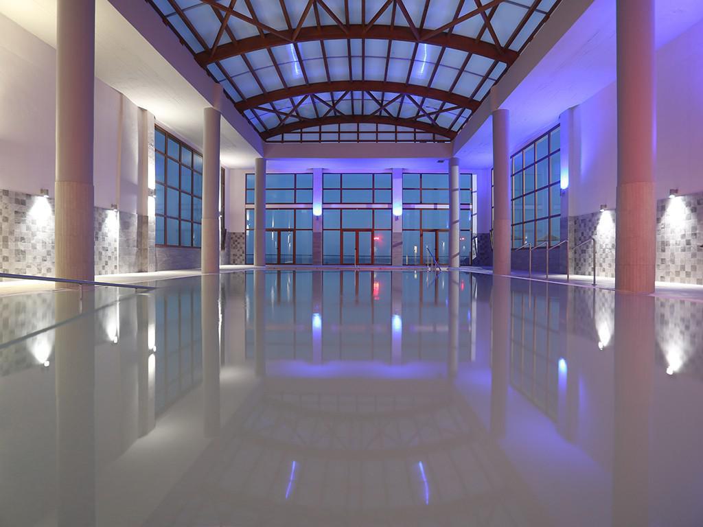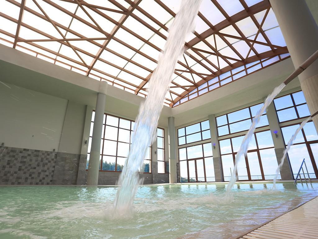 Στην εξωτερική πισίνα η θέα στο πευκοδάσος και τη μεγάλη πράσινη, τη θάλασσα που δεσπόζει στα πόδια σου είναι μαγευτική. Σπάνιας ομορφιάς φύση που δεν συναντάς πουθενά σε παρόμοια λουτρά στον κόσμο.