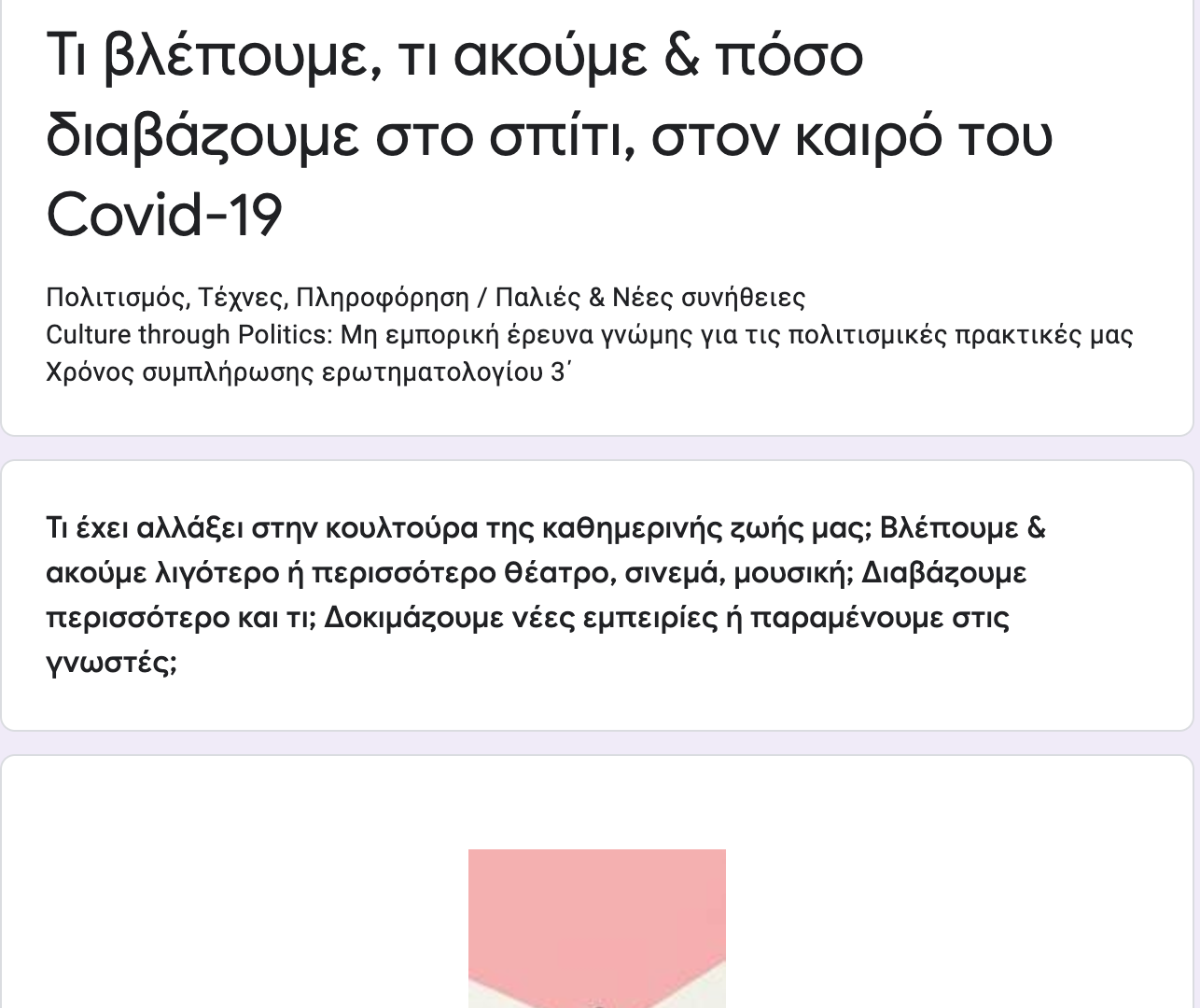 Τα αποτελέσματα της έρευνας θα δημοσιευθούν στη σελίδα Culture through Politics στο F/B και θα οργανωθεί δημόσια συζήτηση με τηλεδιάσκεψη. Μη εμπορική έρευνα γνώμης για τις πολιτισμικές πρακτικές μας.