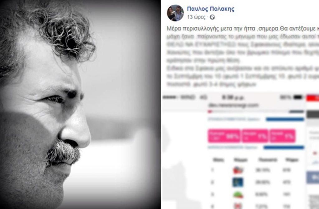 “Μέρα περισυλλογής μετα την ήττα ,σημερα.Θα αντέξουμε και θα δωςουμε τη μάχη ξανα ,παίρνοντας το μηνυμα που μας έδωσαν αυτοί που ΔΕΝ ήρθαν .. ΘΕΛΩ ΝΑ ΕΥΧΑΡΙΣΤΗΣΩ τους Σφακιανους ιδιαίτερα, αλλα και όλους τους Χανιώτες που άντεξαν όλο τον βρωμικο πόλεμο που δεχτήκαμε και μας κράτησαν στην πρώτη θέση . Ειδικα στα Σφακια μας ανέβασαν και σε απόλυτο αριθμό ψήφων σε σχέση με το Σεπτέμβρη του 15 (φωτό 1 Σεπτέμβρης 15 ,φωτό 2 ευρωεκλογές 19 ποσοστά ,φωτό 3-4 άτιμος ψήφων.”