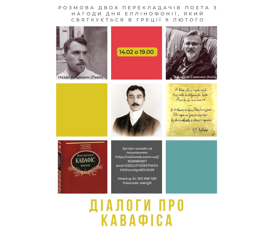 *Η διαδικτυακή συνάντηση «Διάλογοι για τον Καβάφη» θα πραγματοποιηθεί διαδικτυακά στην ουκρανική γλώσσα, στις 14 Φεβρουαρίου, ώρα 19.00, στον σύνδεσμο zoom.