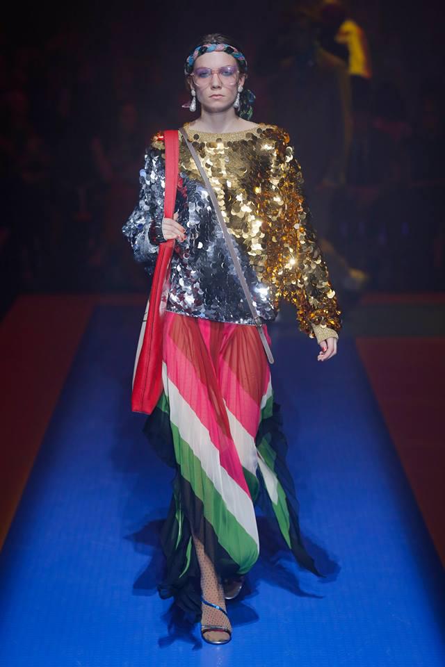 Σε μια αίθουσα σχεδόν σκοτεινή, που έφεγγε μόλις από μερικά φωτιστικά φλας και διακοσμημένη με γλυπτά εμπνευσμένα από τα μεγαλύτερα σύμβολα της ανθρωπότητας, όπως ένας γελαστός Βούδας και ο σοφός Θωθ, θεότητα των Αιγυπτίων, ο Gucci παρουσίασε ένα ντεφιλέ γεμάτο από κοστούμια σε ίσια γραμμή, πολύ σατέν, κρόσια, παγιέτες και άλλα έγχρωμα και εντυπωσιακά στοιχεία, με τα περισσότερα μοντέλα να φορούν στρογγυλά γυαλιά.