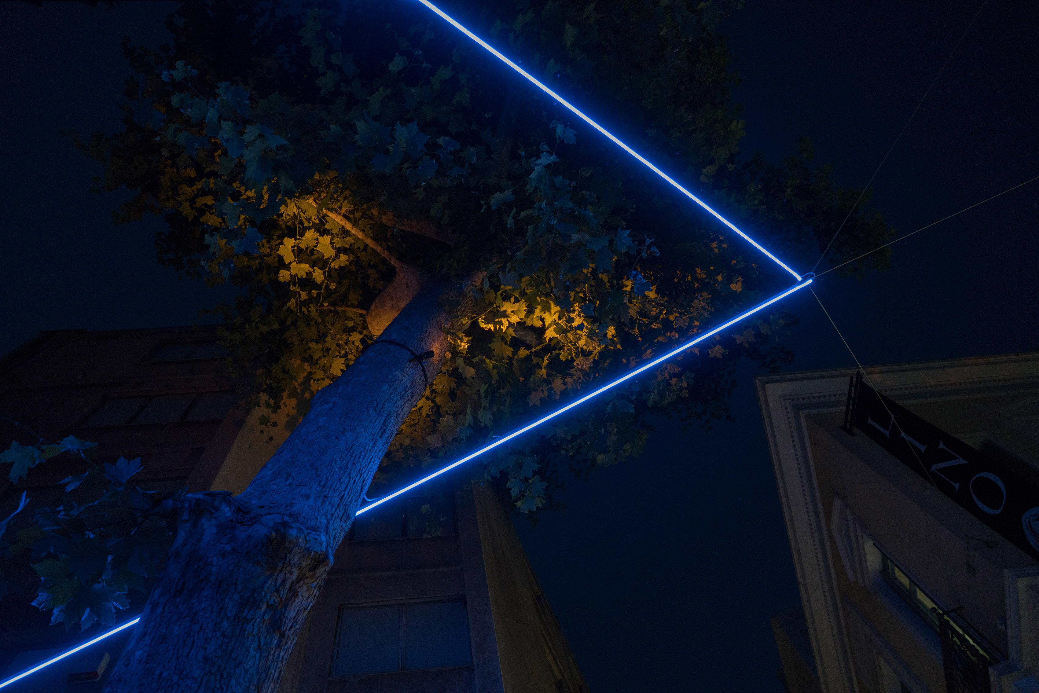 Η πρόταση Falling Triangles περιλαμβάνει φωτιστικές εγκαταστάσεις σε 2 κομβικά σημεία επί της Αγ. Μάρκου: