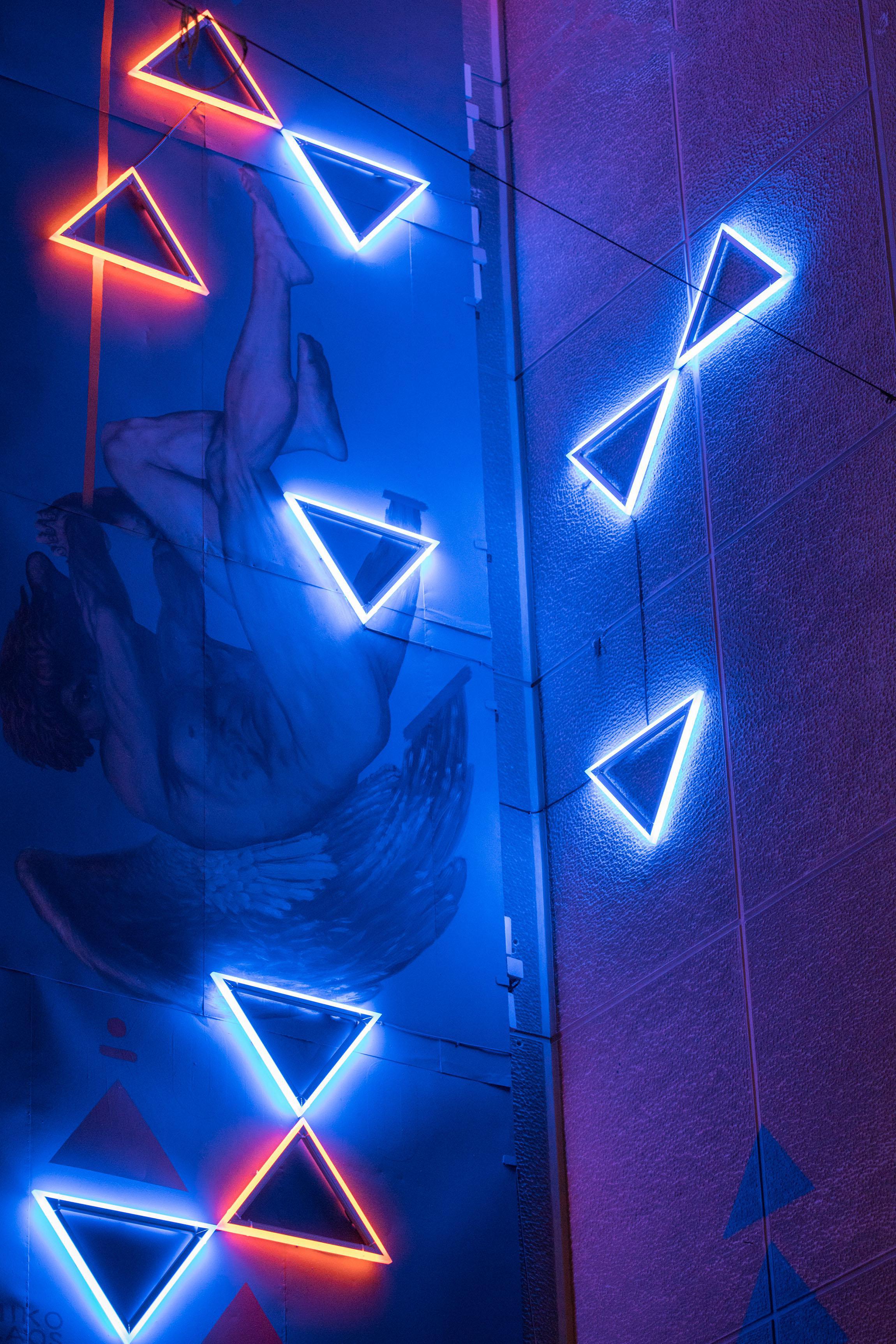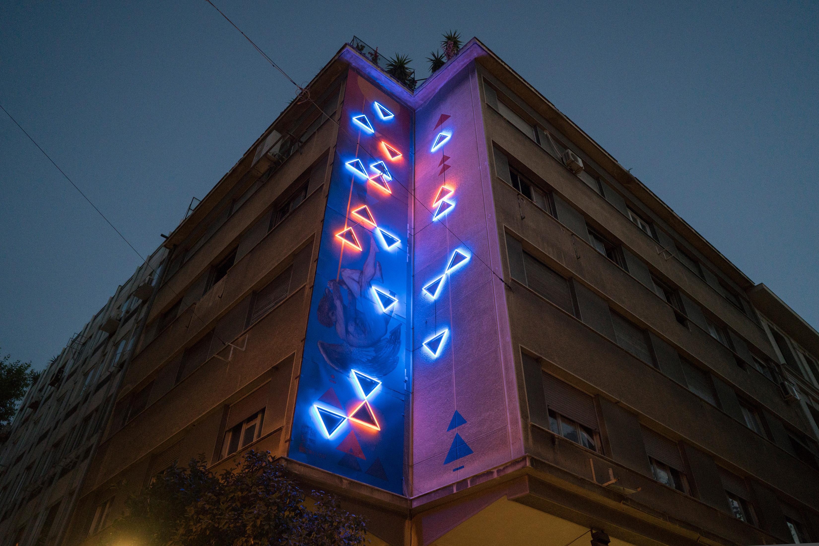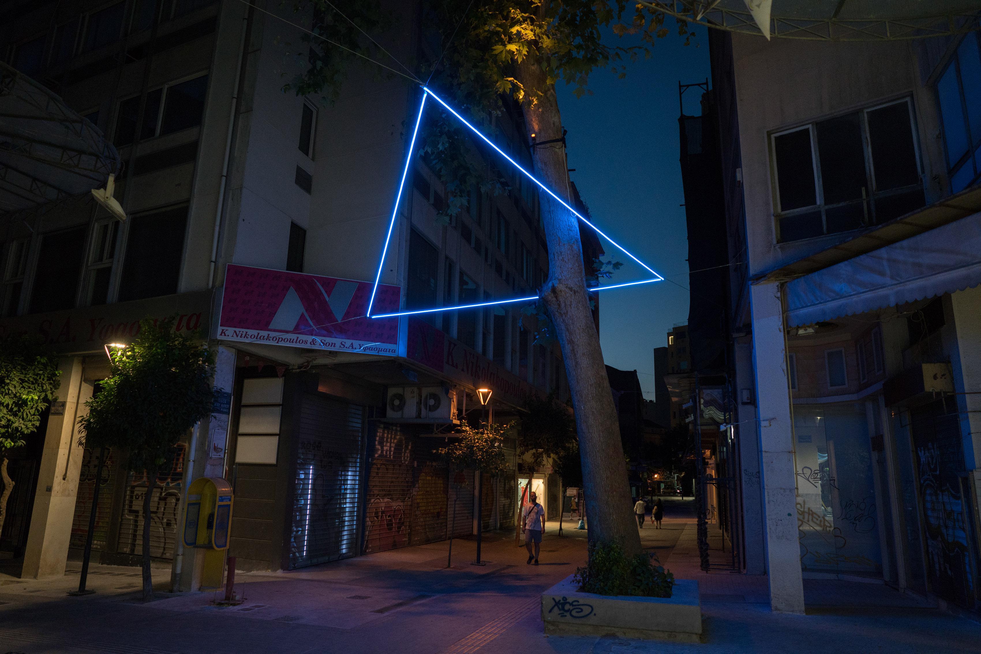 α. Στο σόκορο πολυκατοικίας στη συμβολή Αγ. Μάρκου και Χρυσοσπηλιωτίσσης, μία συστάδα φωτεινών τριγώνων έρχεται σε διάλογο με την τοιχογραφία Ikarus του καλλιτέχνη Νικόλαου Τσουνάκα που απεικονίζει τον Ίκαρο-Άγγελο σε πτώση.