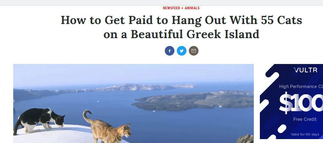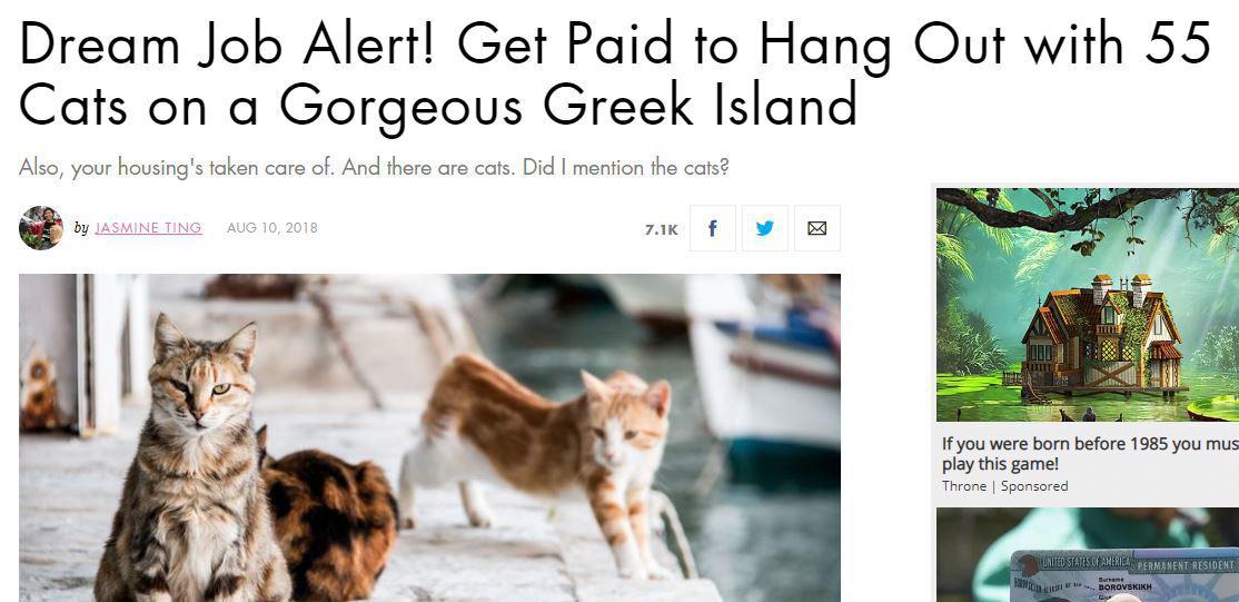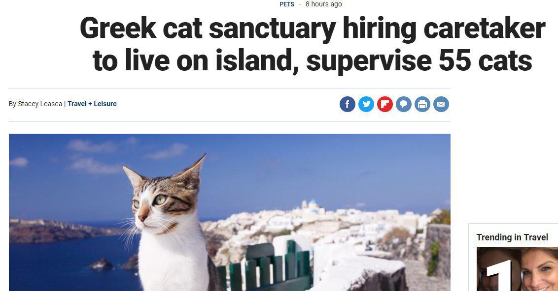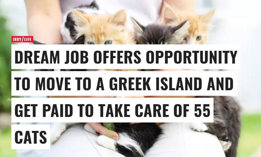 Το καταφύγιο ζώων God’s Little People Cat Rescue ζητά έναν γατόφιλο για να φροντίζει 55 γάτες επί πληρωμή (δείτε την αγγελία ΕΔΩ) και προκλήθηκε φρενίτιδα ενθουσιασμού σε όσους το είδαν ως μια ευκαιρία για ποιότητα ζωής και εργασίας.