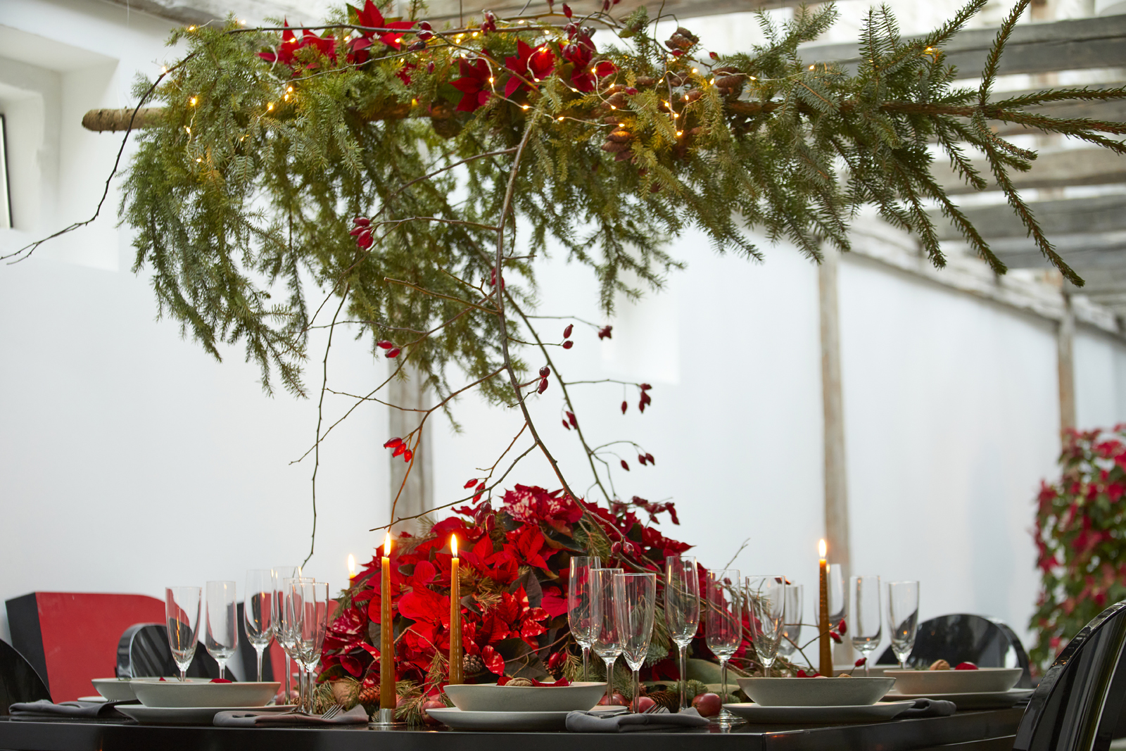 Ένα χριστουγεννιάτικο δέντρο στολισμένο με μίνι αλεξανδρινά και μια σειρά από φωτάκια, κρεμασμένα οριζόντια πάνω από το τραπέζι, αποτελεί ένα φανταστικό στοιχείο σε ψηλοτάβανους χώρους. Τα κρεμαστά κλαδιά τριανταφυλλιάς γεφυρώνουν οπτικά το κενό προς το μπολ με πουρνάρια που κοσμεί το τραπέζι.