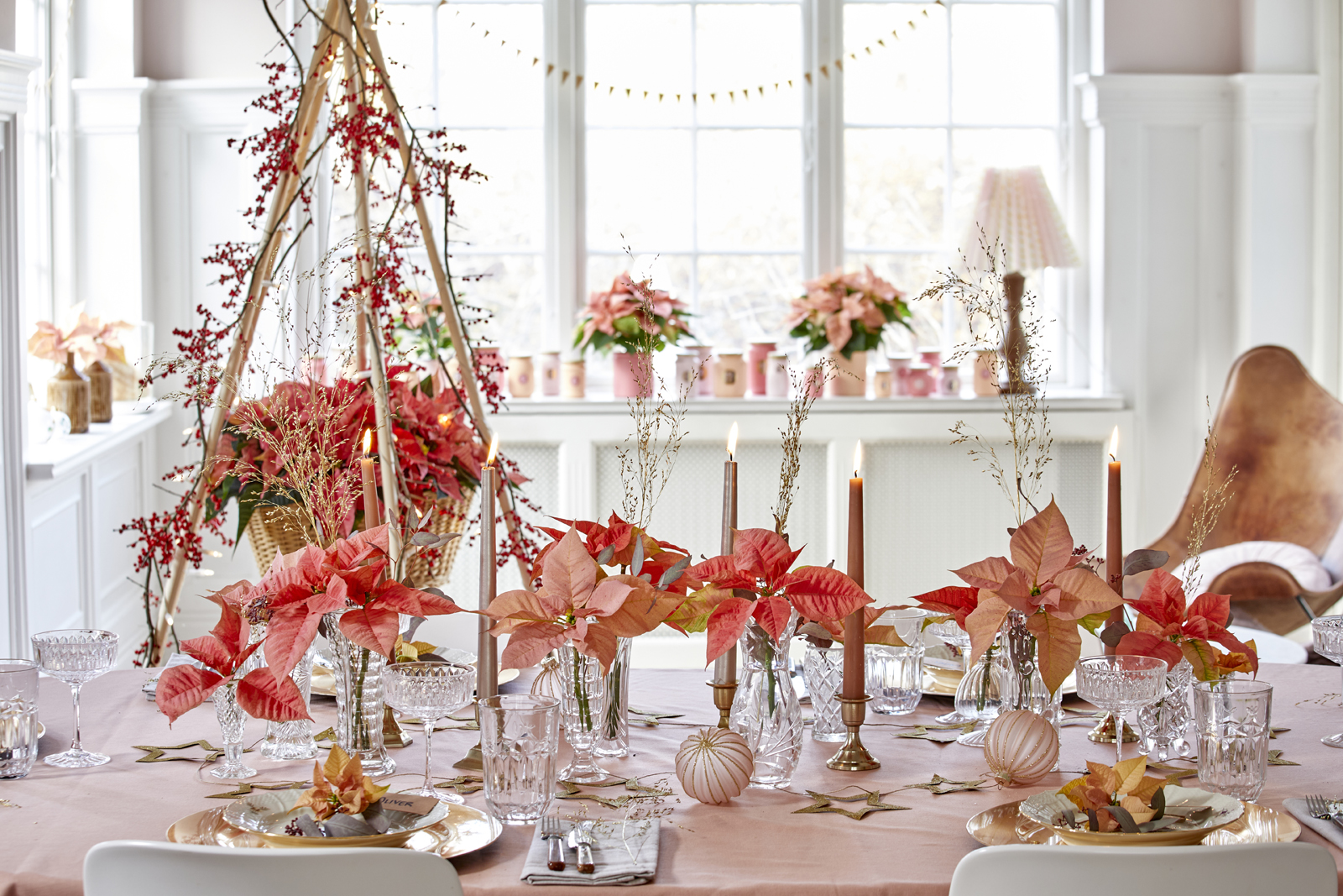 Τα κομμένα αλεξανδρινά παίζουν τον πρωταγωνιστικό ρόλο σε αυτό το παραμυθένιο επιτραπέζιο κομμάτι σε απαλές ροζ αποχρώσεις. Τα στολίδια, τα σερβίτσια, τα κεριά και τα vintage κρυστάλλινα ποτήρια δημιουργούν μια συναρπαστική αντίθεση με το μοντέρνο χριστουγεννιάτικο δέντρο στο βάθος.