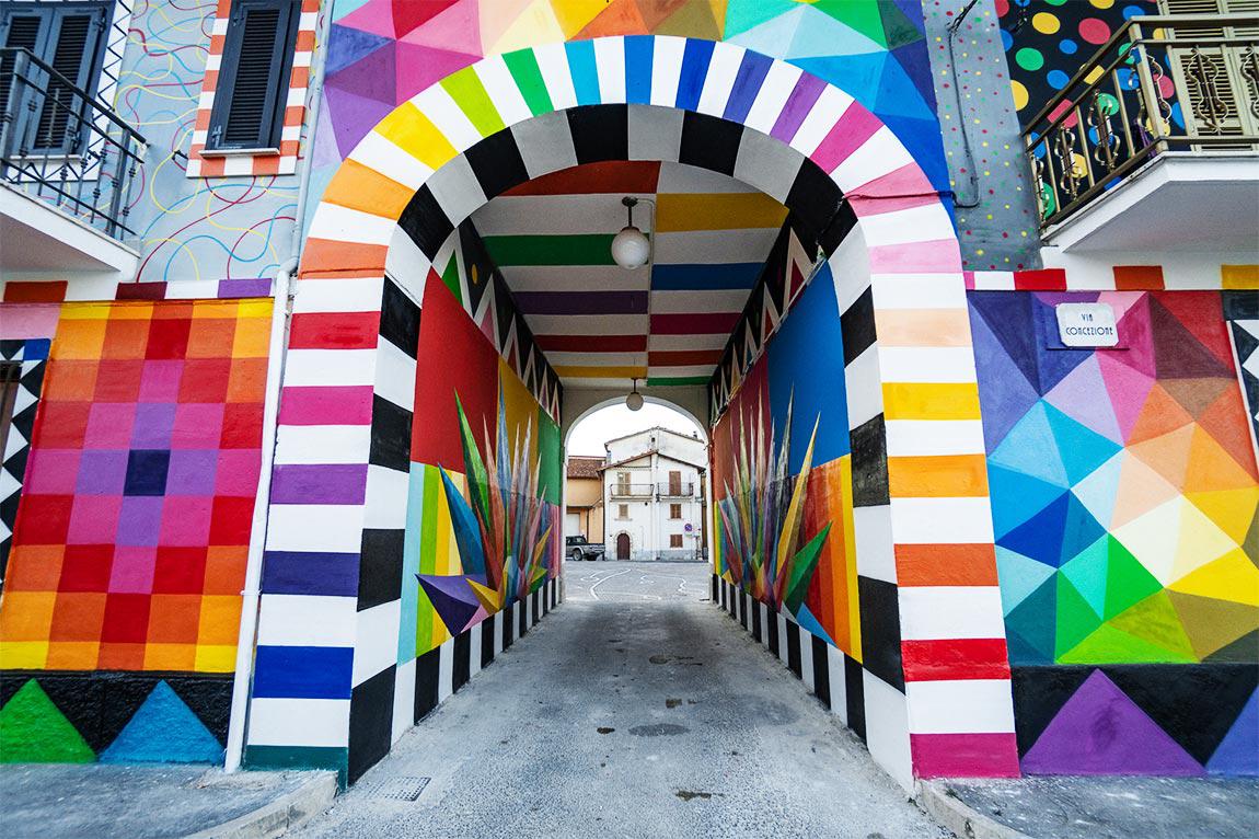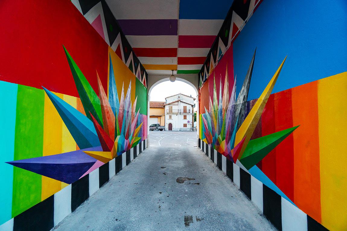 Ο Okuda San Miguel είχε εμφανιστεί το 2019, για την τρίτη έκδοση του Borgo Universo culture Festival, στην ιταλική πόλη Aielli. Το μεσαιωνικό αυτό μέρος του έδωσε έμπνευση για το επόμενο του εγχείρημα και αποφάσισε να εργαστεί σε ολόκληρο το τείχος ενός κτηρίου. Η τοιχογραφία του έφερε τον τίτλο «Φωτεινό παλάτι».