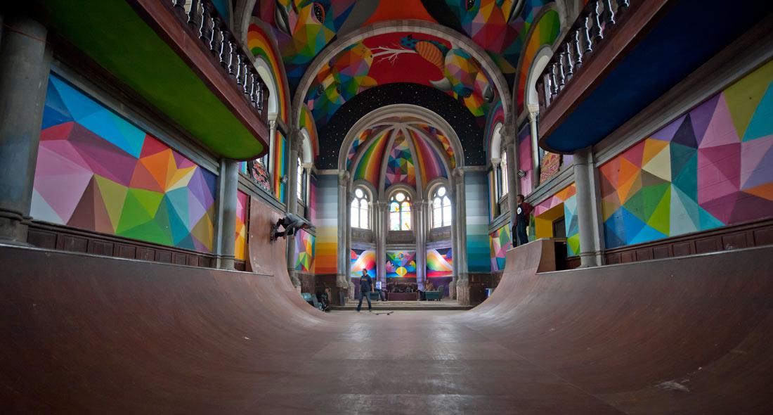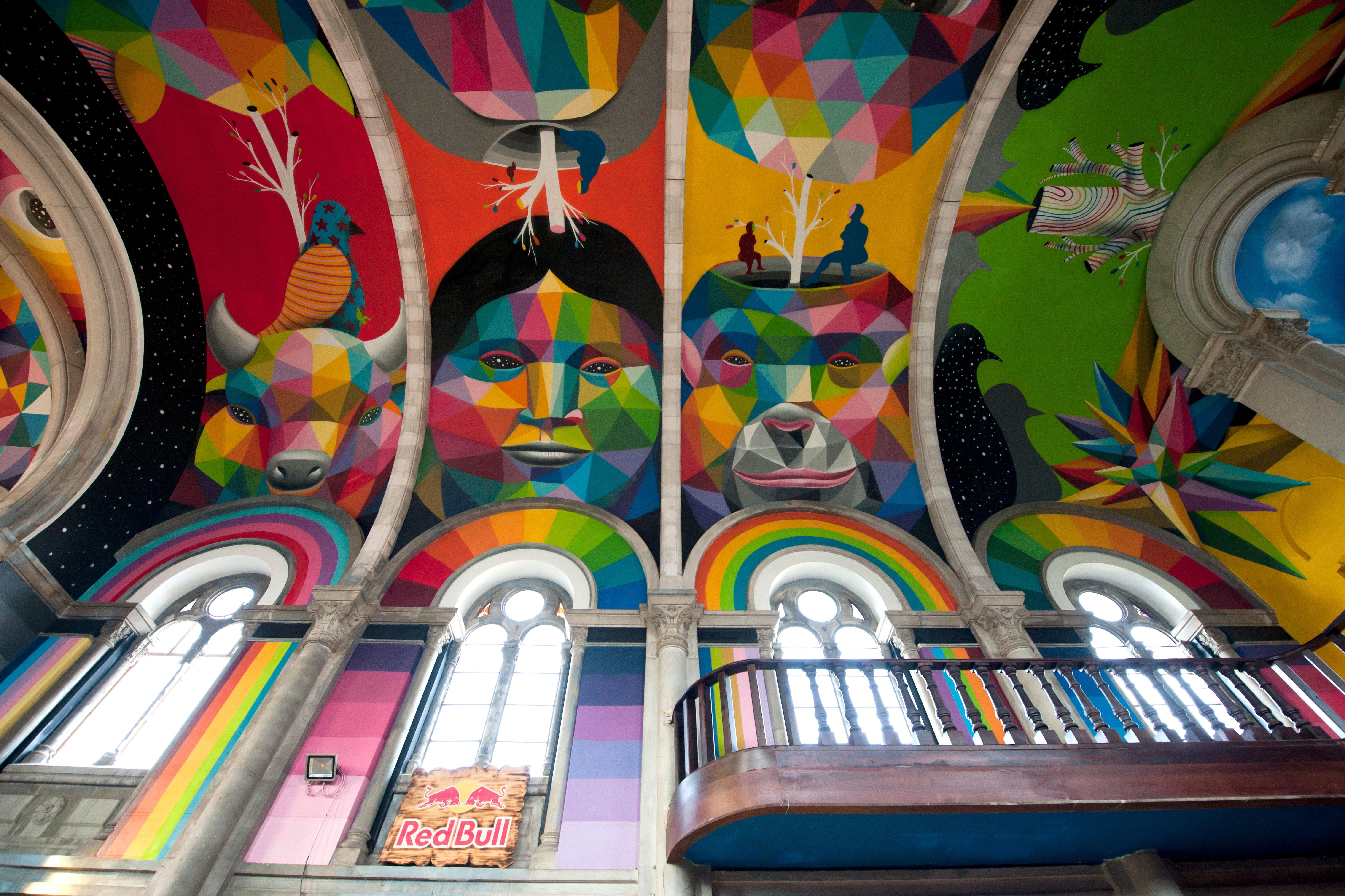 Ο Okuda San Miguel έγινε πρώτη φορά γνωστός για τη ζωγραφική του στον ναό Kaos στη Asturia. Μια παλιά εκκλησία μετατράπηκε σε «Μέκκα» για τους λάτρεις του skate και της σύγχρονης τέχνης. Με τίτλο “Kaos Temple”, ο καλλιτέχνης ήθελε να διατηρήσει την αίσθηση της πνευματικότητας του κτηρίου, δημιουργώντας έναν κόσμο γεμάτο ζωή, χρώμα και ευτυχία.