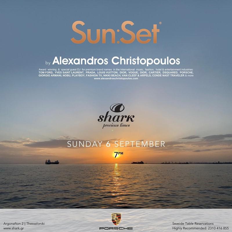 Αποχαιρέτησε την εβδομάδα, με ένα κοκτέιλ δίπλα στο ηλιοβασίλεμα και μουσικές επιλογές από τον top του είδους Αλέξανδρο Χριστόπουλο. O διάσημος Έλληνας παραγωγός και dj επιστρέφει στο Shark την ερχόμενη Κυριακή για ένα Sun:Set event, με μουσικές που θα σε απογειώσουν. Απόλαυσέ τον σπεύδοντας να κλείσεις ένα τραπέζι δίπλα στη θάλασσα.