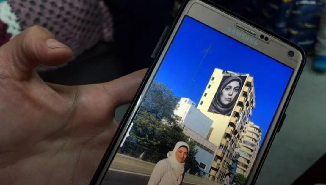 Πρόκειται για μια τεράστια αφίσα της Salsabil Maatouk που σε κοιτά κατάματα από ψηλά. Η ίδια είναι Σύρια πρόσφυγας που ζει στην πόλη.